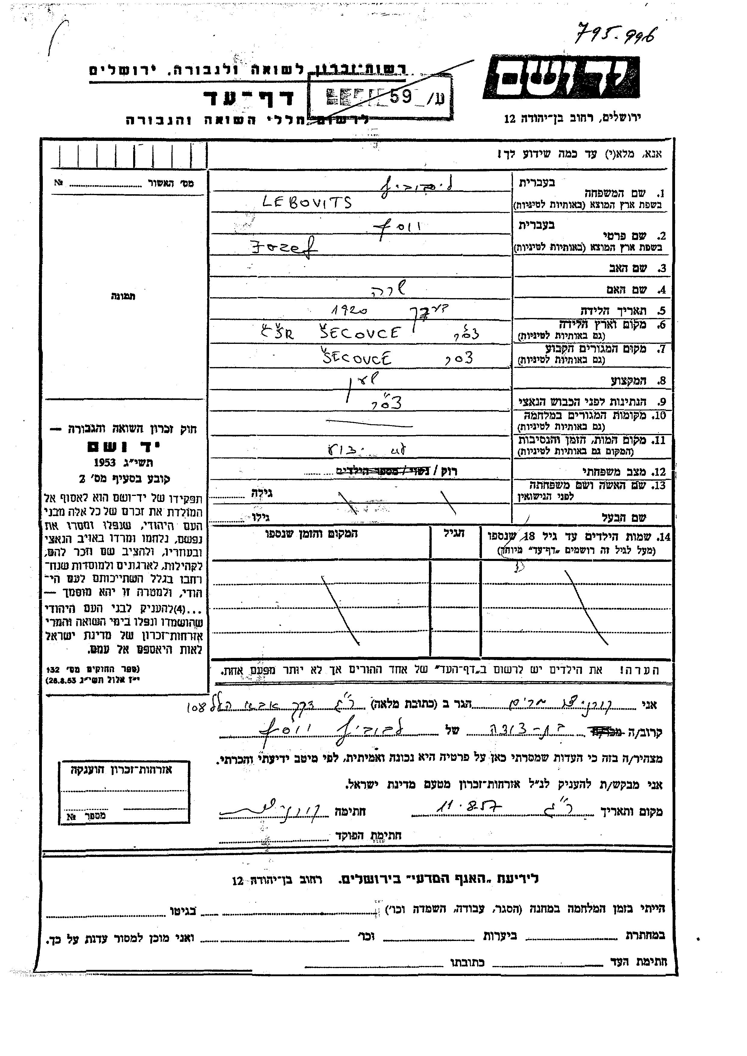 | Lebovits | Jozef | 1920 | Secovce, Tchécoslovaquie | Feuille de témoignage |
