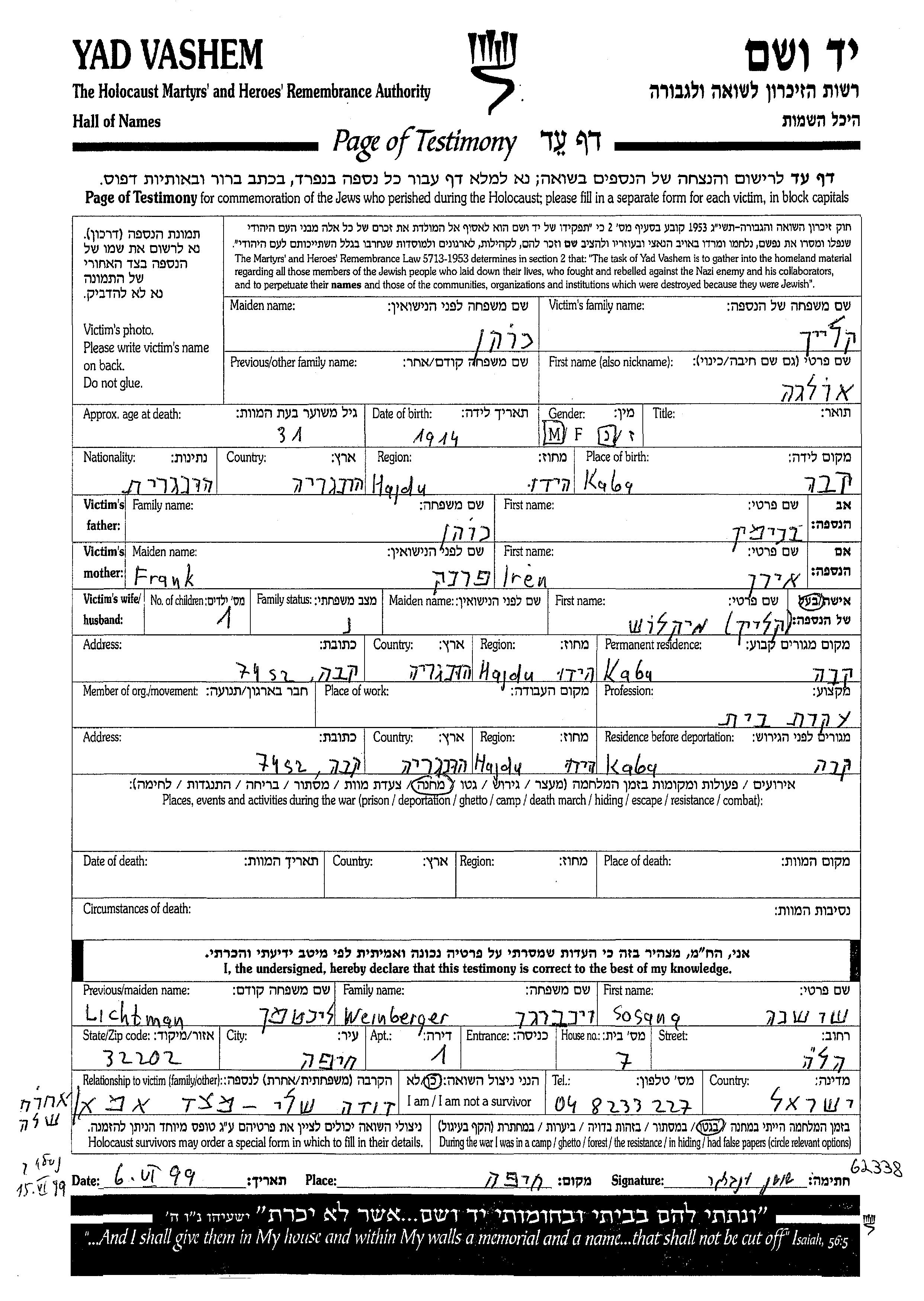 | Klein | Olga | 1914 | Kaba, Hongrie | Feuille de témoignage |