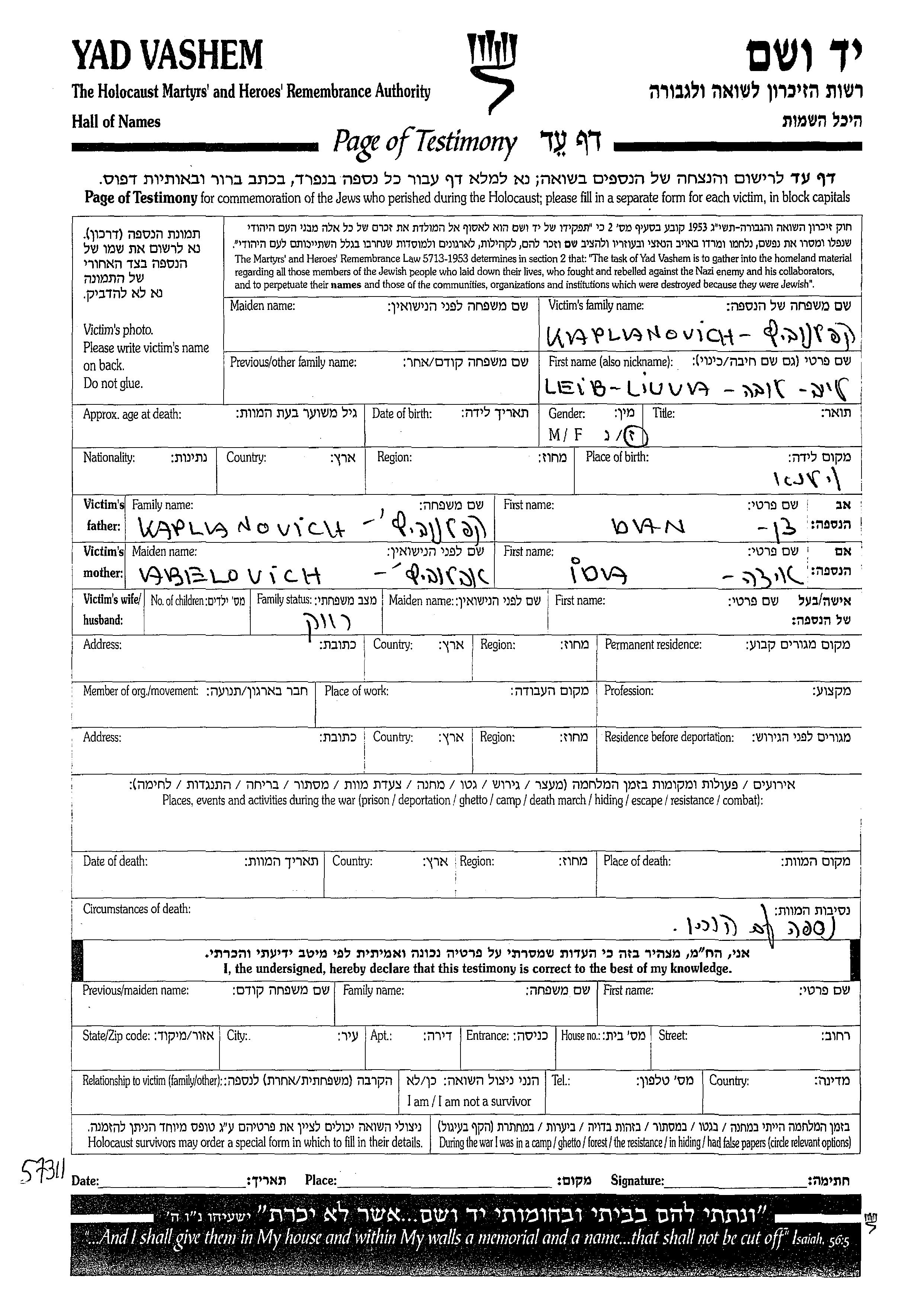 Kaplanowicz Arje L Leib 1918 Wilno, Pologne Feuille de témoignage