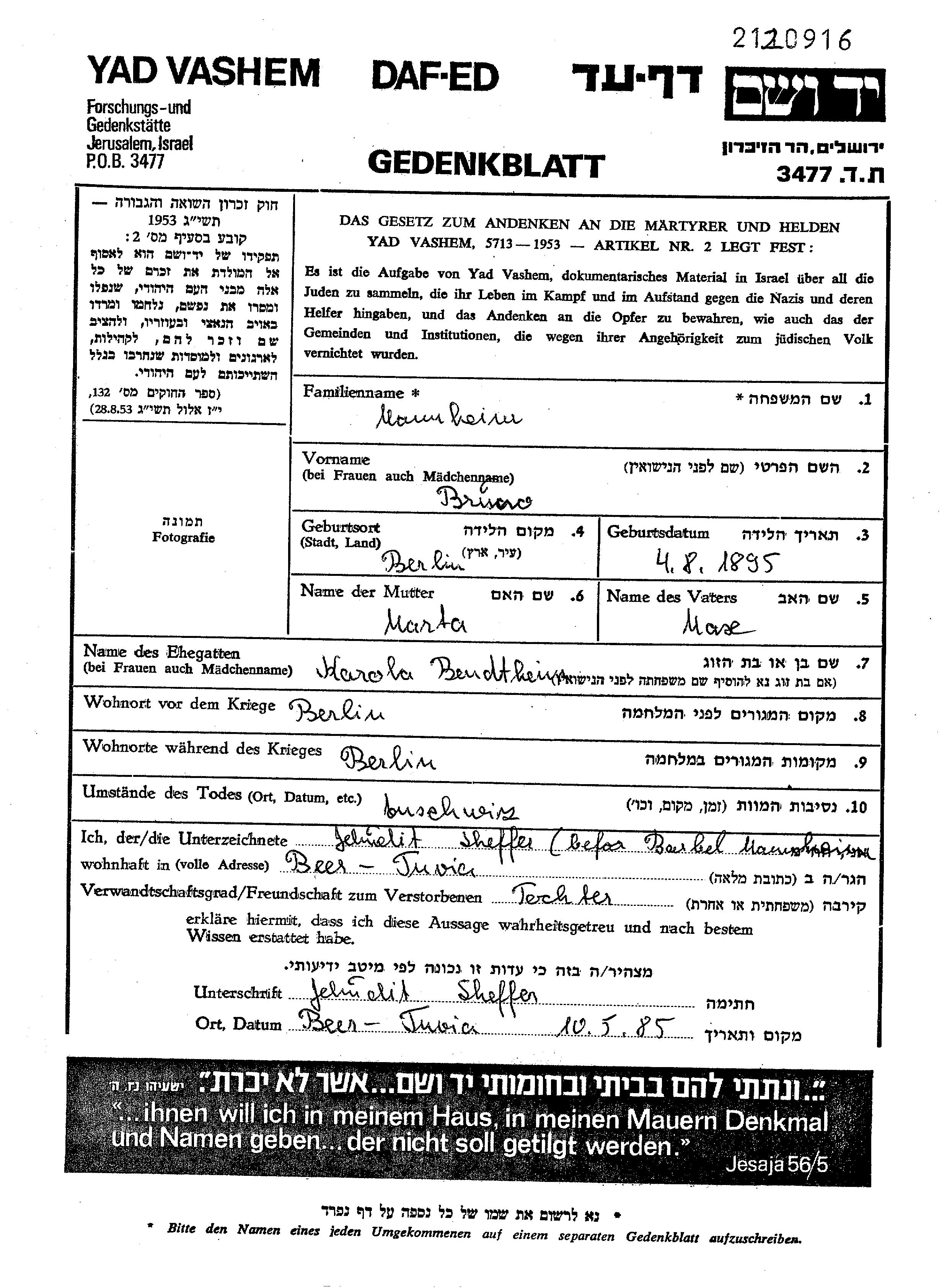 | Mannheim | Bruno | 1895 | Berlin, Allemagne | Feuille de témoignage |