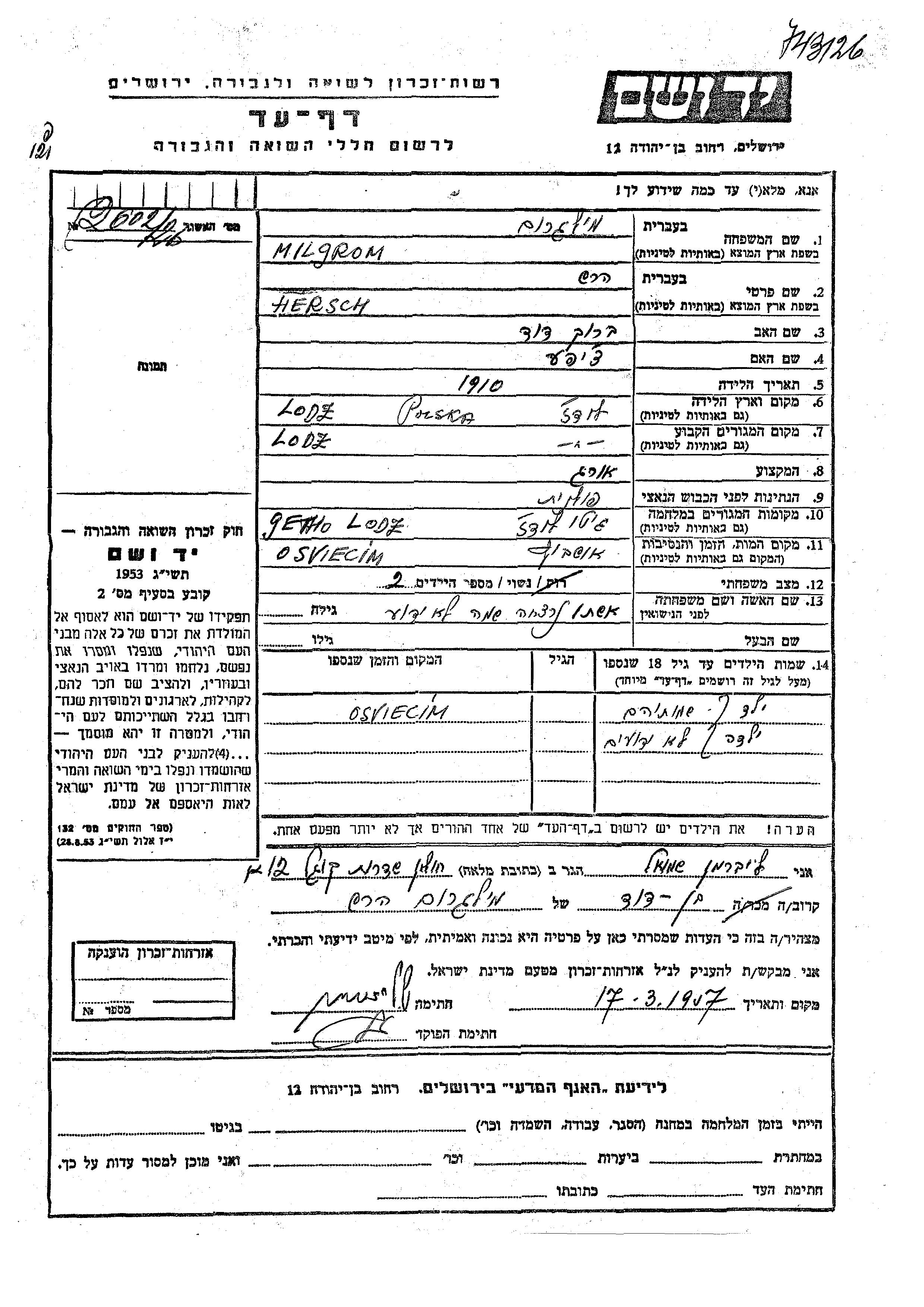 Milgrom | Hersch | 1910 | Lodz, Pologne | Feuille de témoignage |