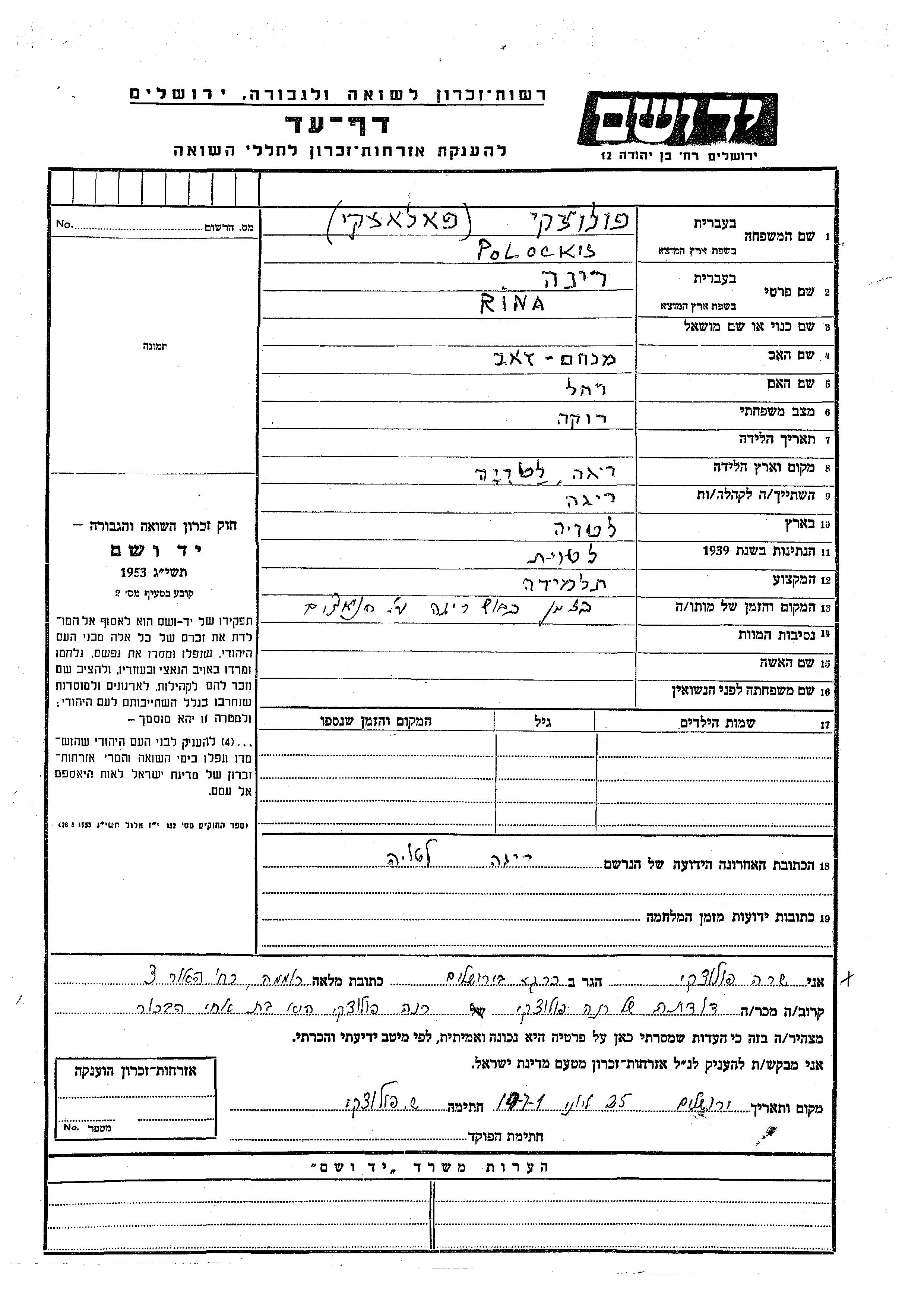 Polockis Rina endroit inconnu, Feuille de témoignage