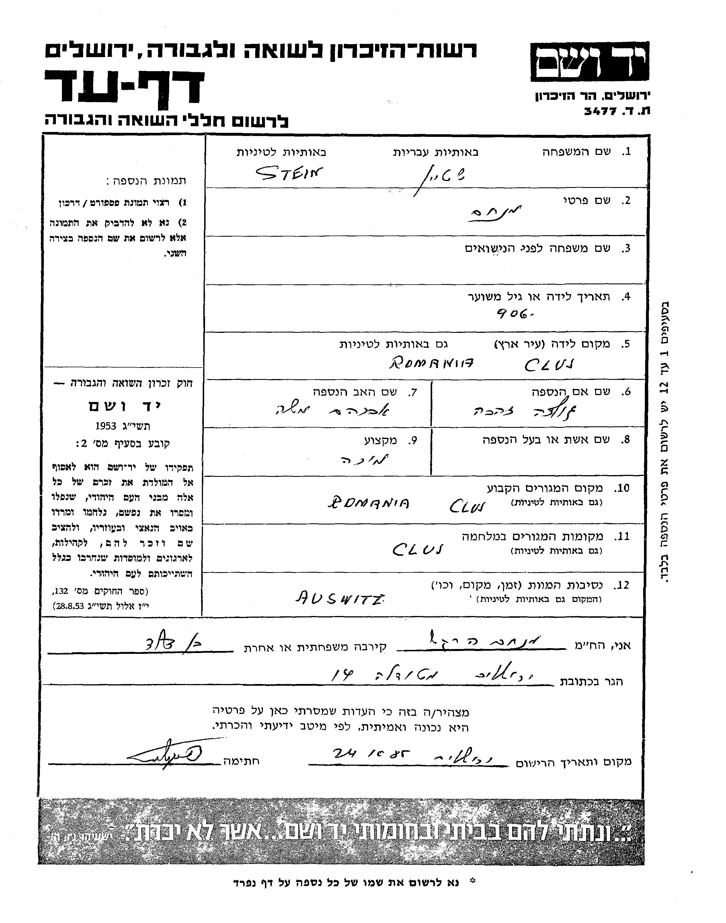 Stein Menakhem 1906 Cluj, Roumanie Feuille de témoignage