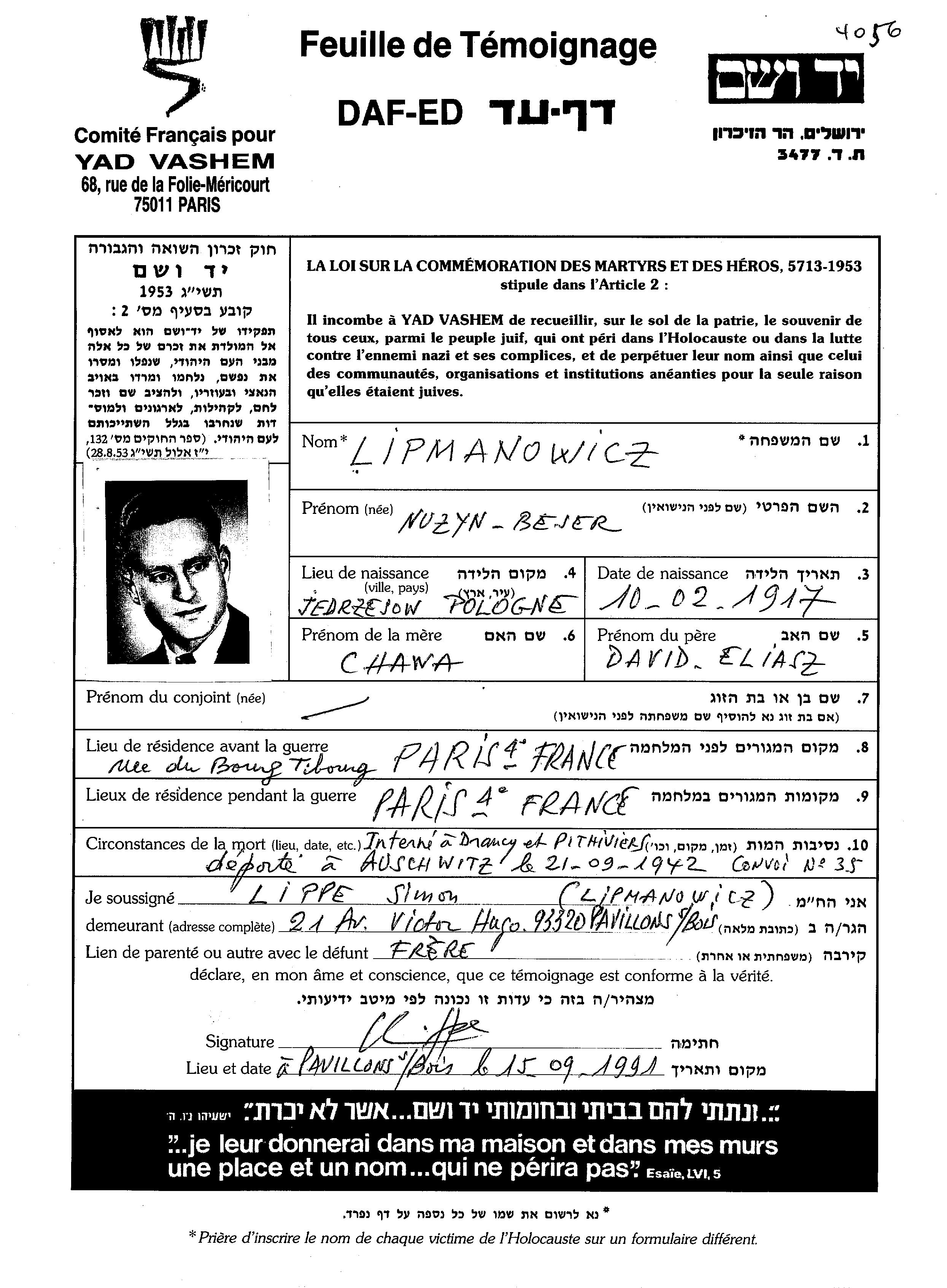 Bejar Bernard Nuzyn Lipmanowicz est né à Jedrzejow, Pologne en 1917. Avant la seconde guerre mondiale il vivait à Paris, France.