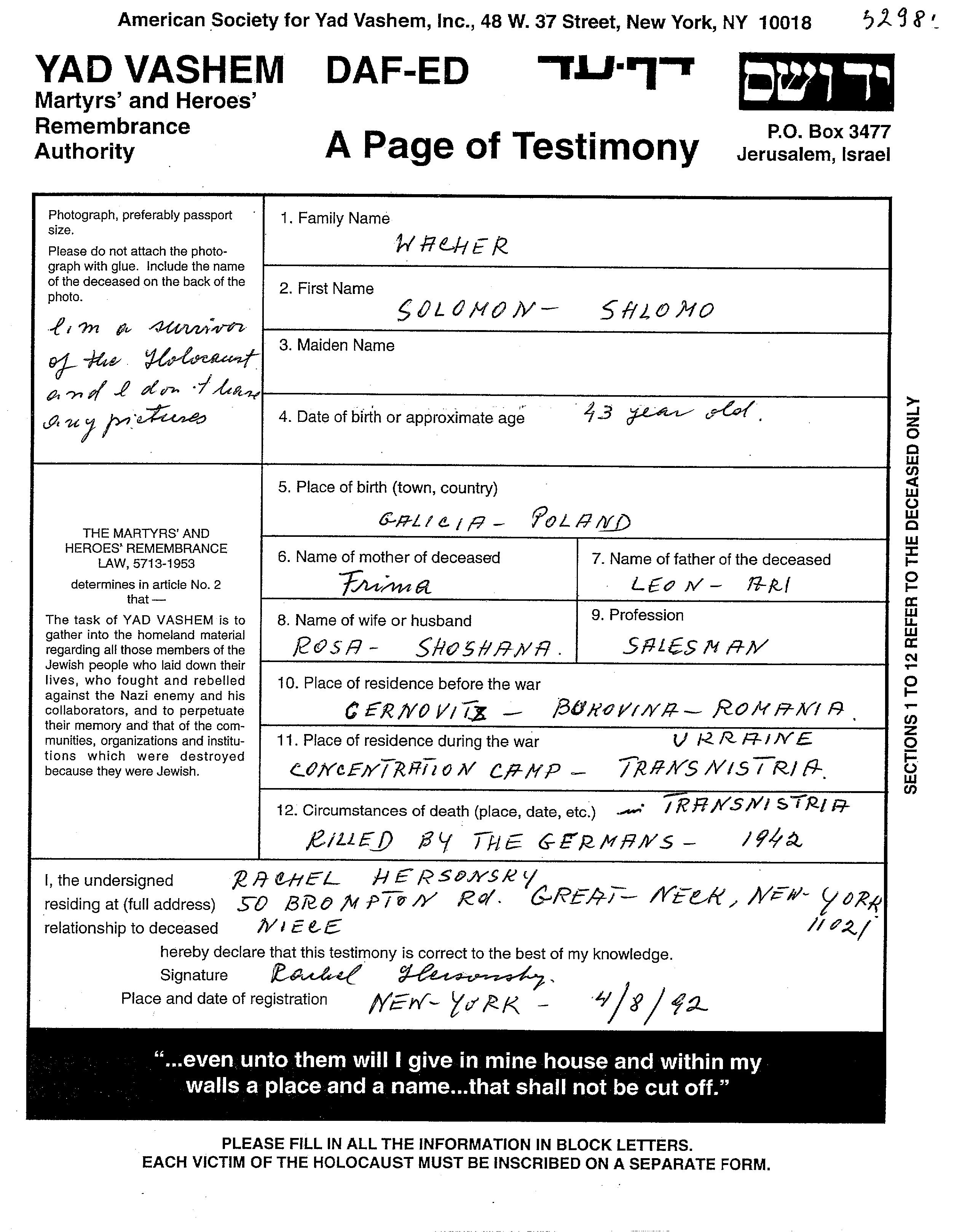 Wacher | Solomon | 1899 | Czernowitz, Roumanie | Feuille de témoignage |