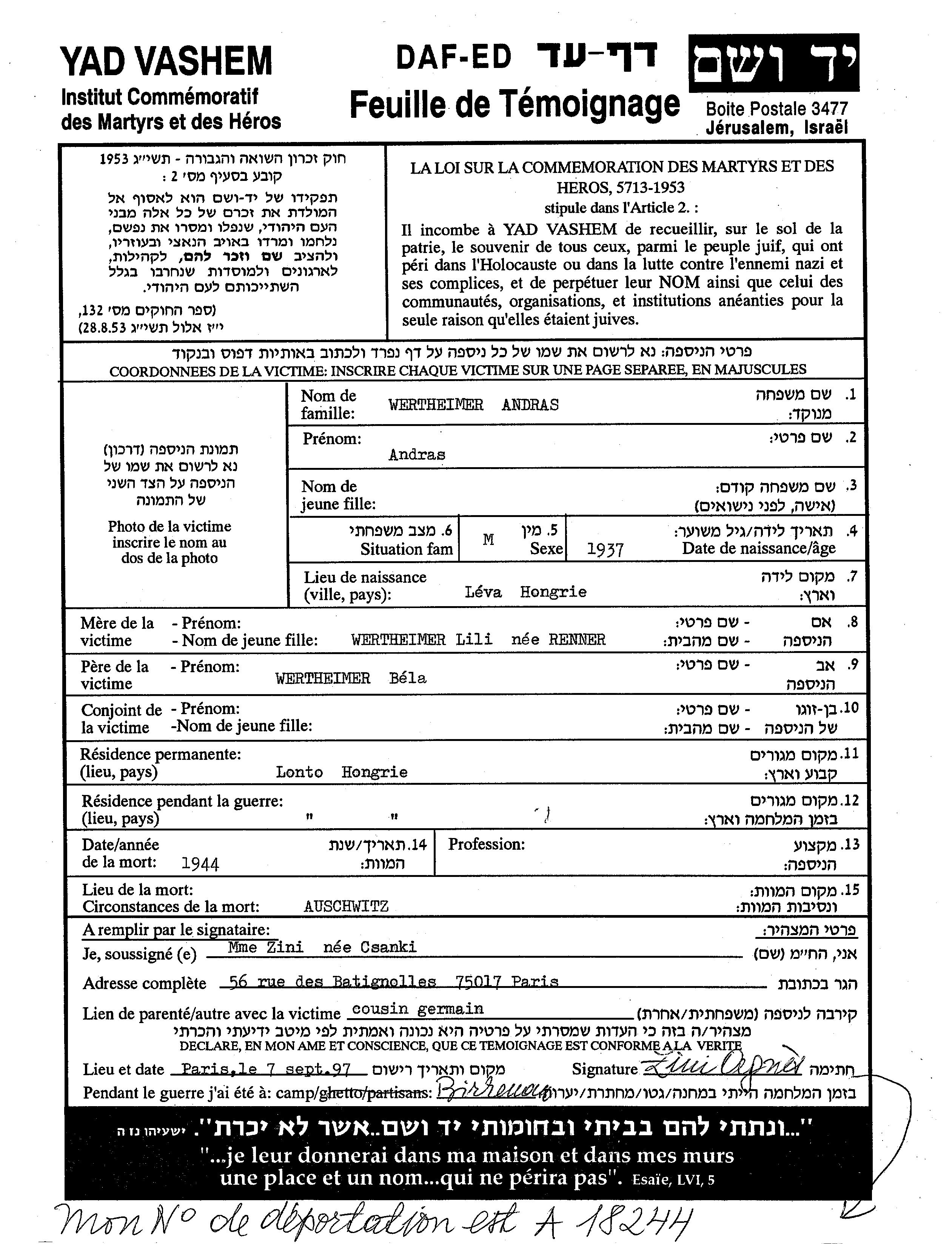 Werteimer Andras 1937 Lonto, Tchécoslovaquie Feuille de témoignage