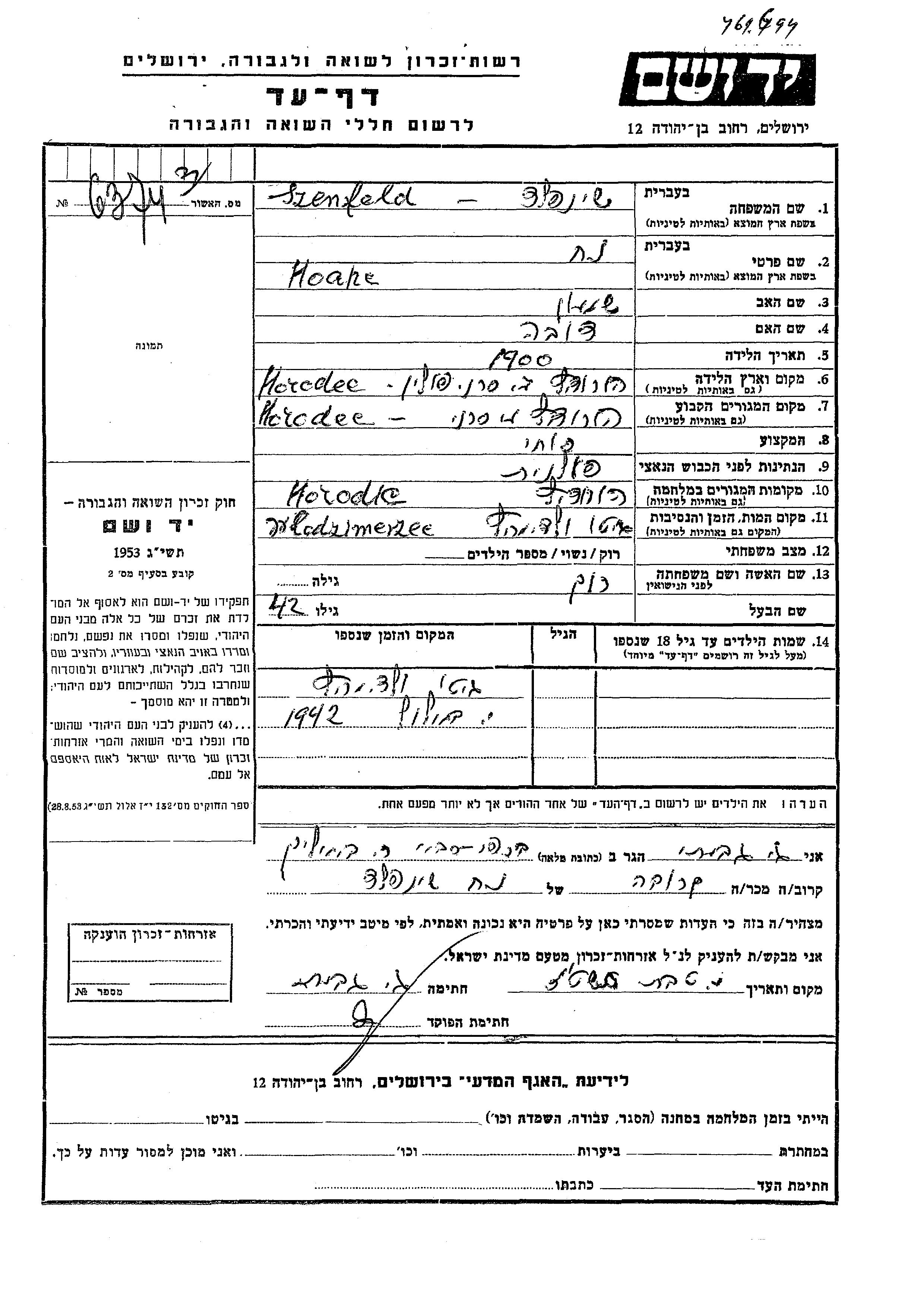 Szenfeld Noah 1900 Horodec, Pologne Feuille de témoignage