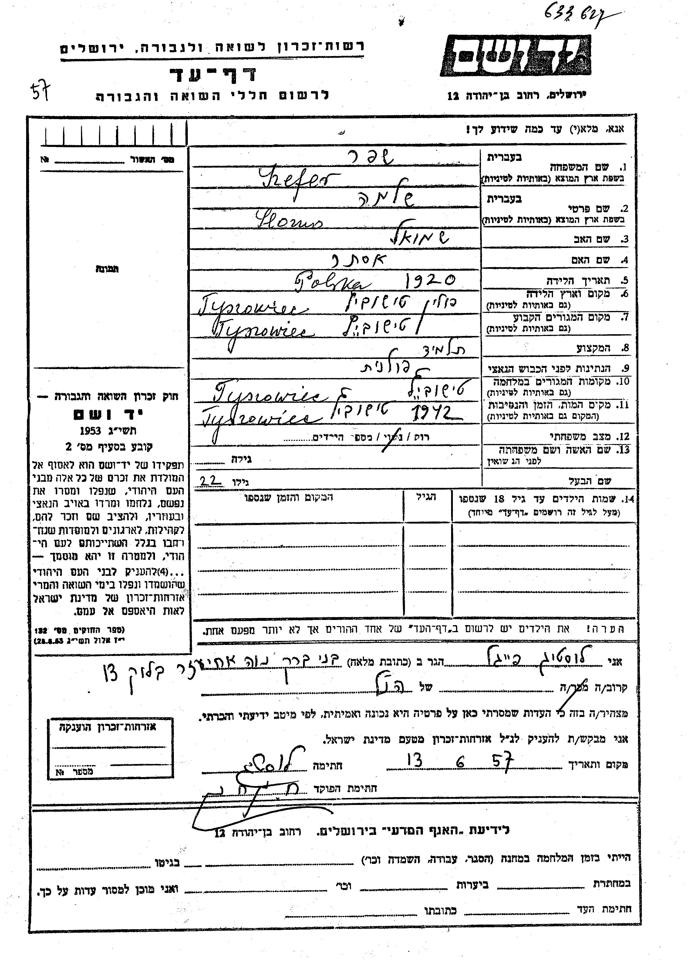 | Shefer | Slomo | 1920 | Tyszowic, Pologne | Feuille de témoignage |