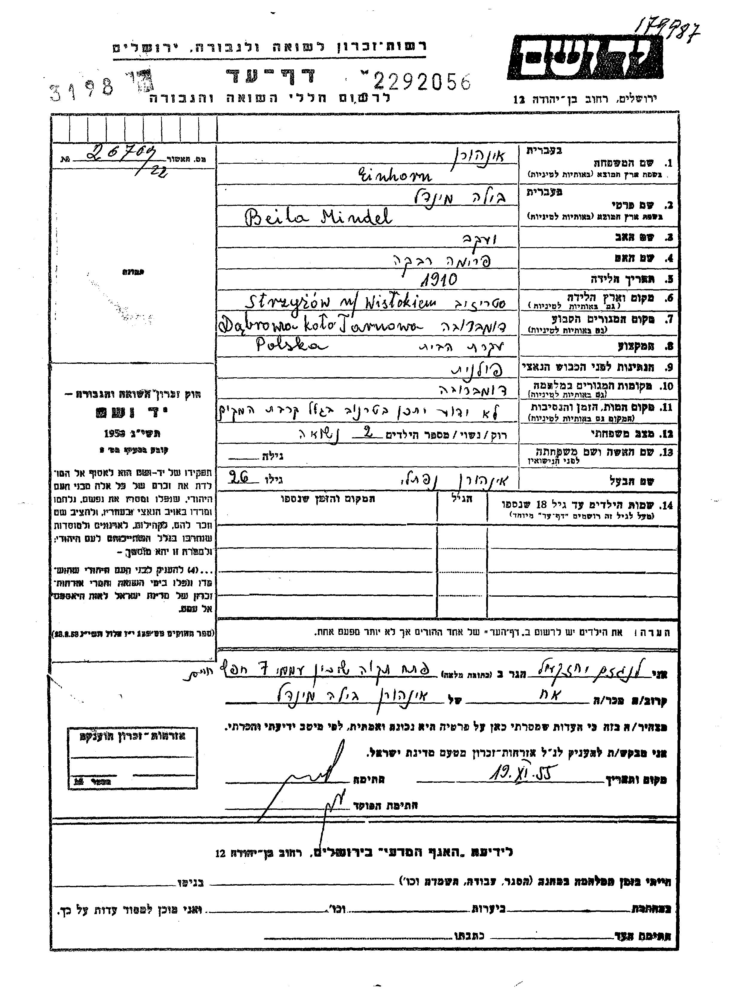 Einhorn Beila Dombrova, Pologne Feuille de témoignage