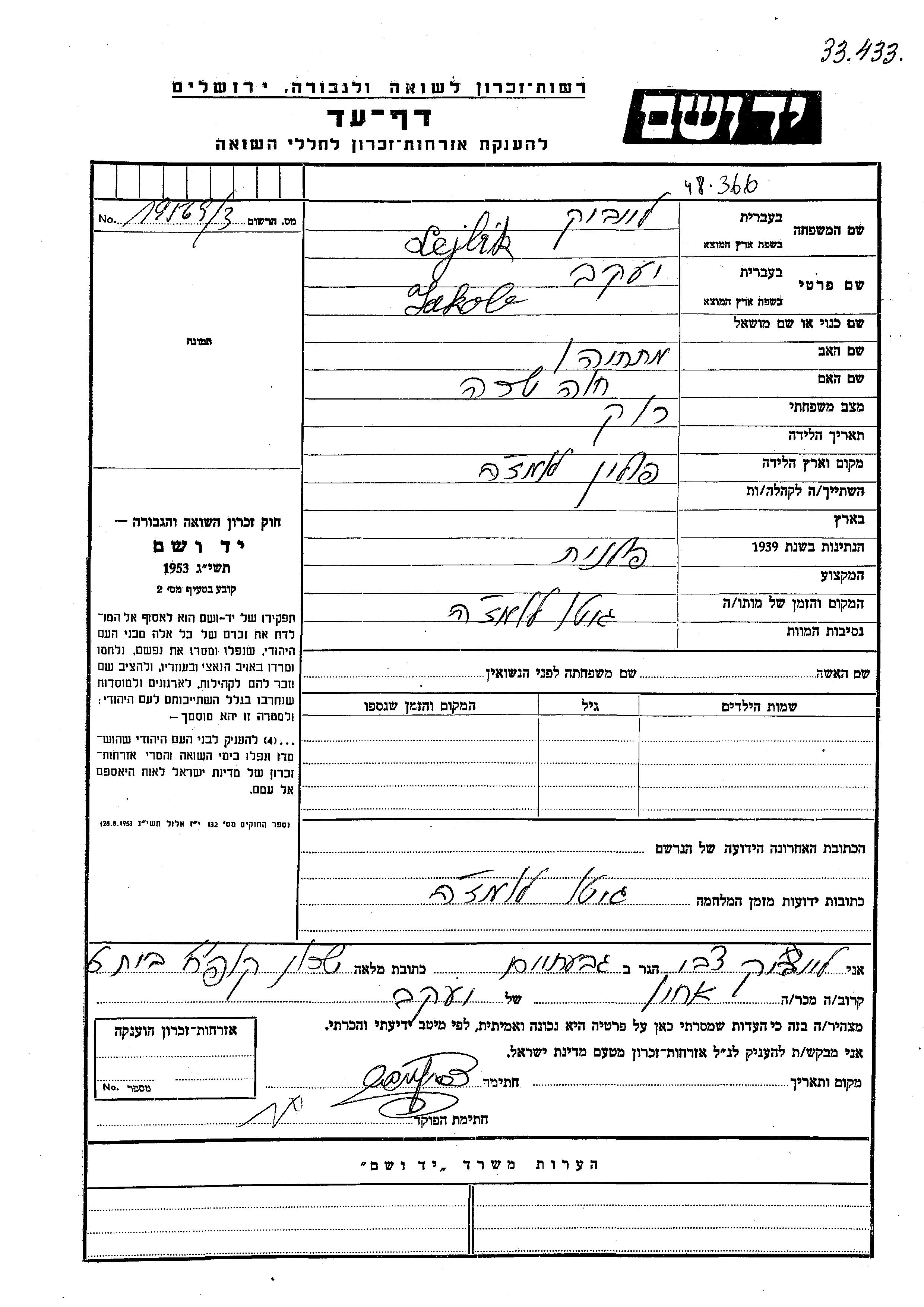 Lejbik | Yaakov | endroit inconnu, | Feuille de témoignage |