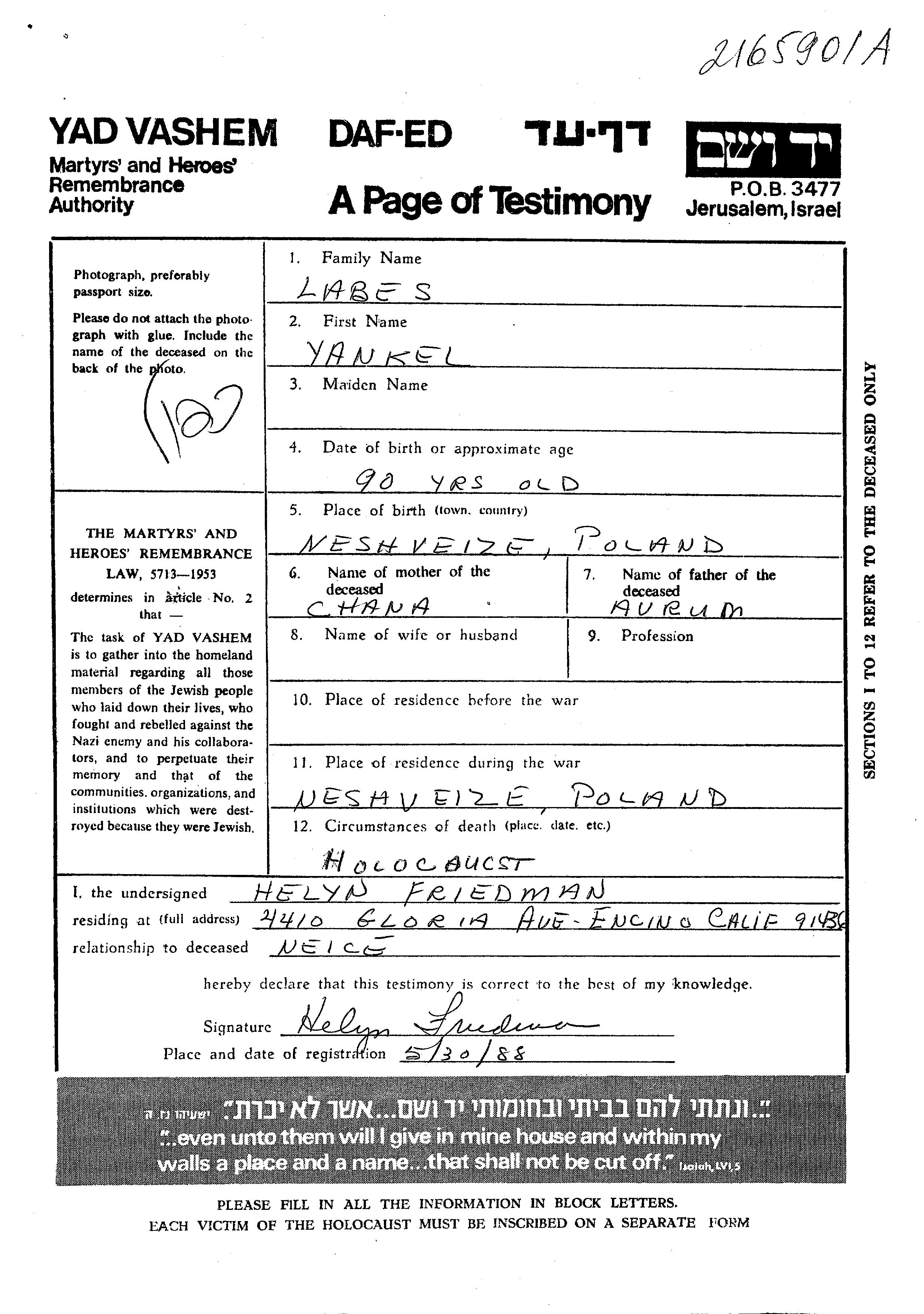 Yankel Labes est né à Nieśwież, Pologne en 1897. Avant la seconde guerre mondiale il vivait à Nieśwież, Pologne.