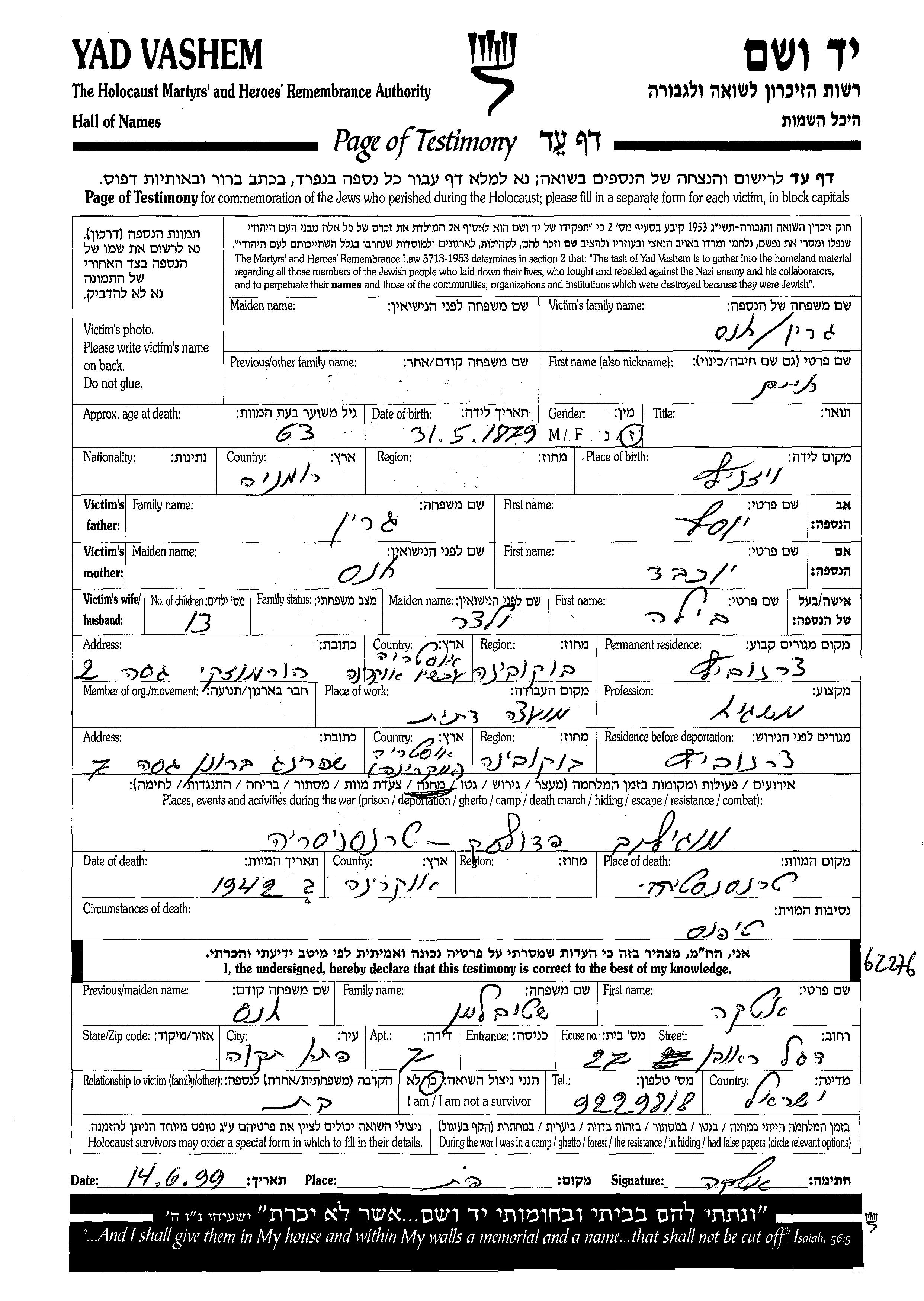 Yad Vashem - Pages of Testimony Names Memorial Collection