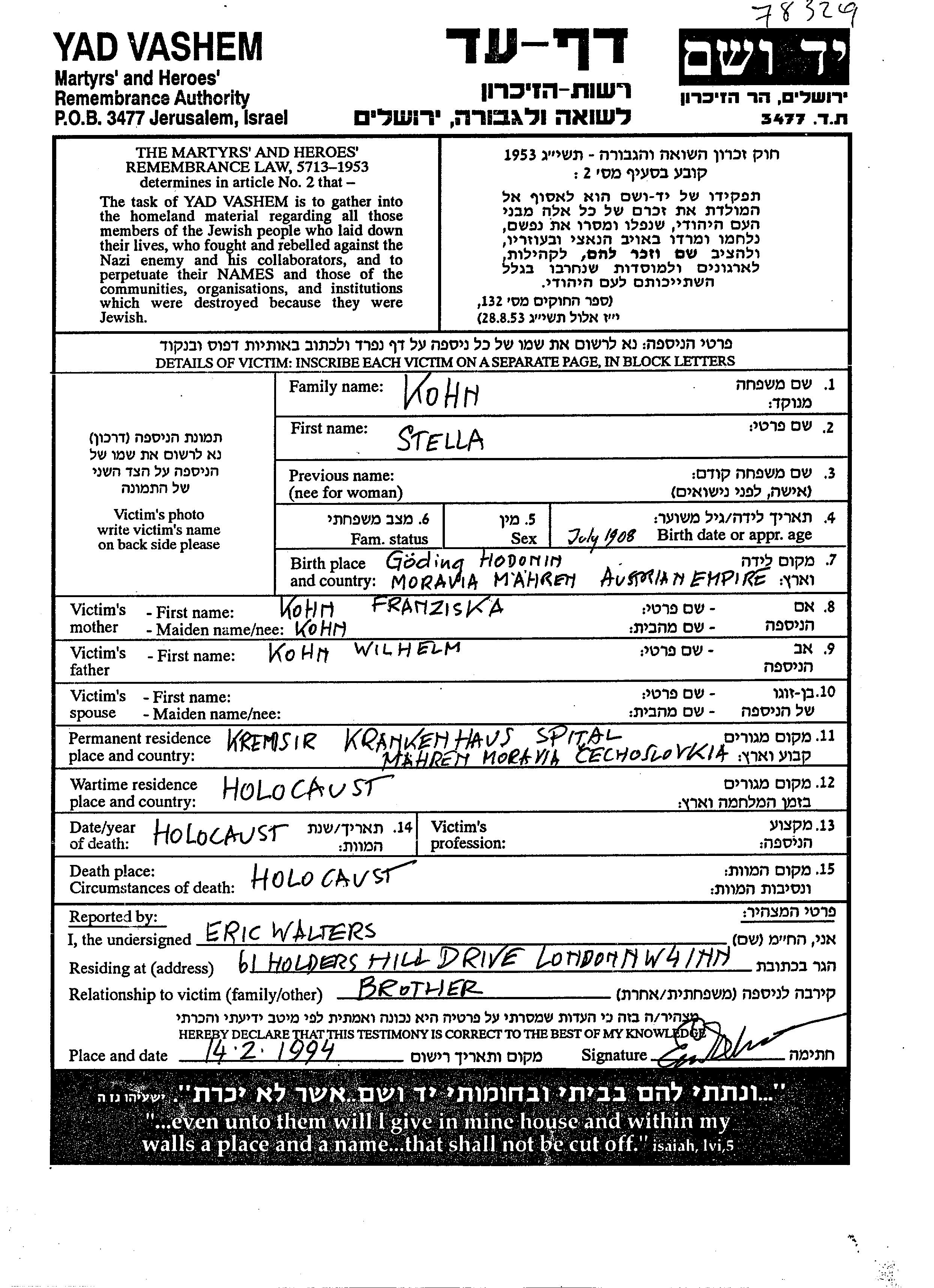 Stella Kun Kohn est née à Hodonin, Tchécoslovaquie en 1908. Avant la seconde guerre mondiale elle vivait à Bohemia, Tchécoslovaquie.