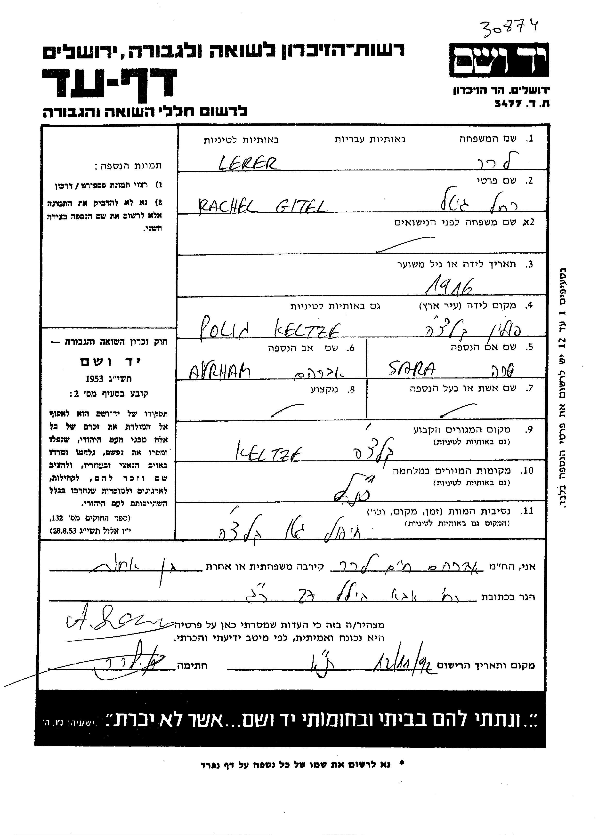Lerer Rakhel Gitel 1919 Kielce, Pologne Feuille de témoignage