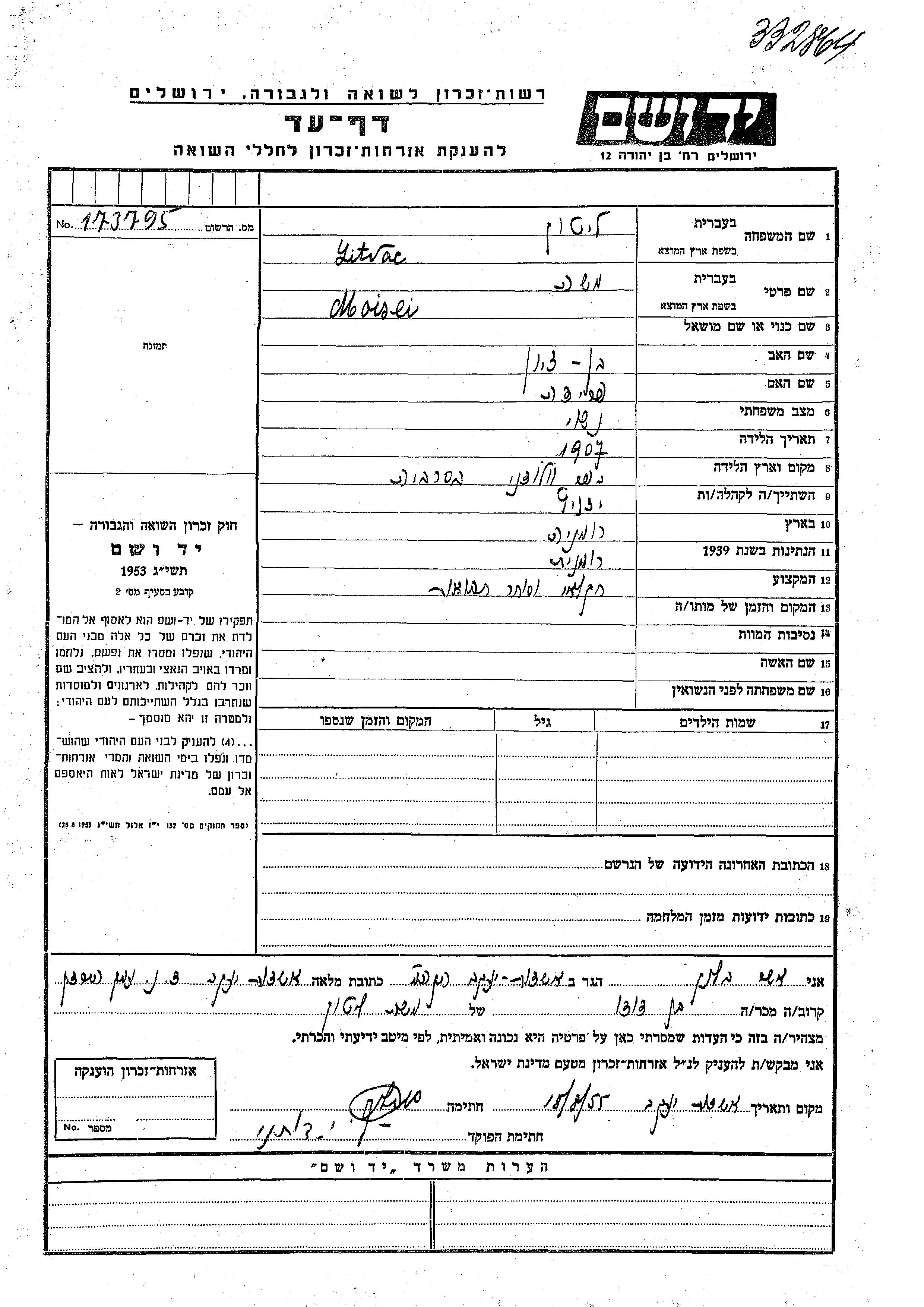 Litvac Moise 1907 Edineţi, Roumanie Feuille de témoignage