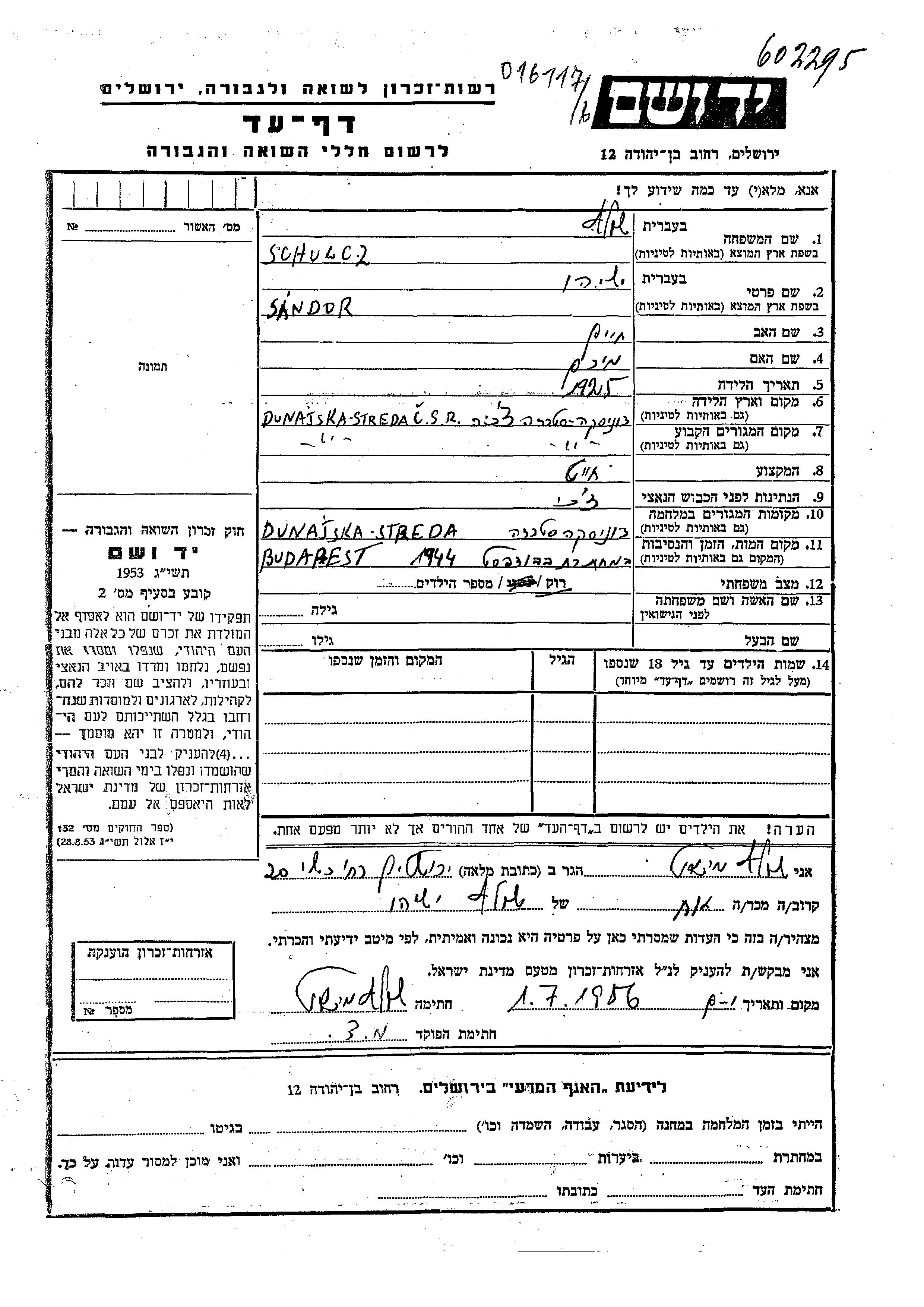 Schulcz Sandor Ieshaiahu 1925 Dunajska Streda, Tchécoslovaquie Feuille de témoignage