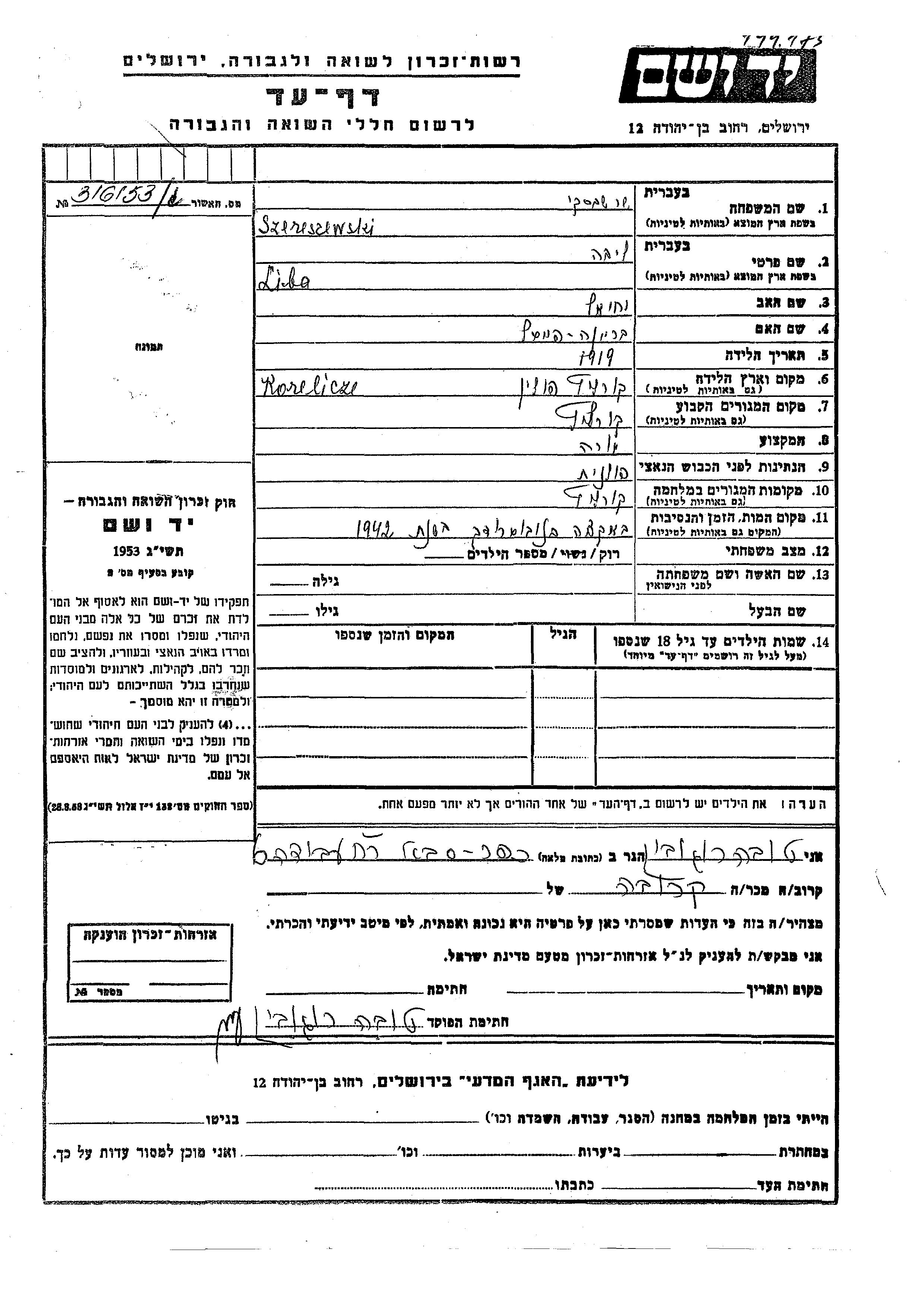 Szereszewski Sharshevski Liba 1919 Korelicze, Pologne Feuille de témoignage