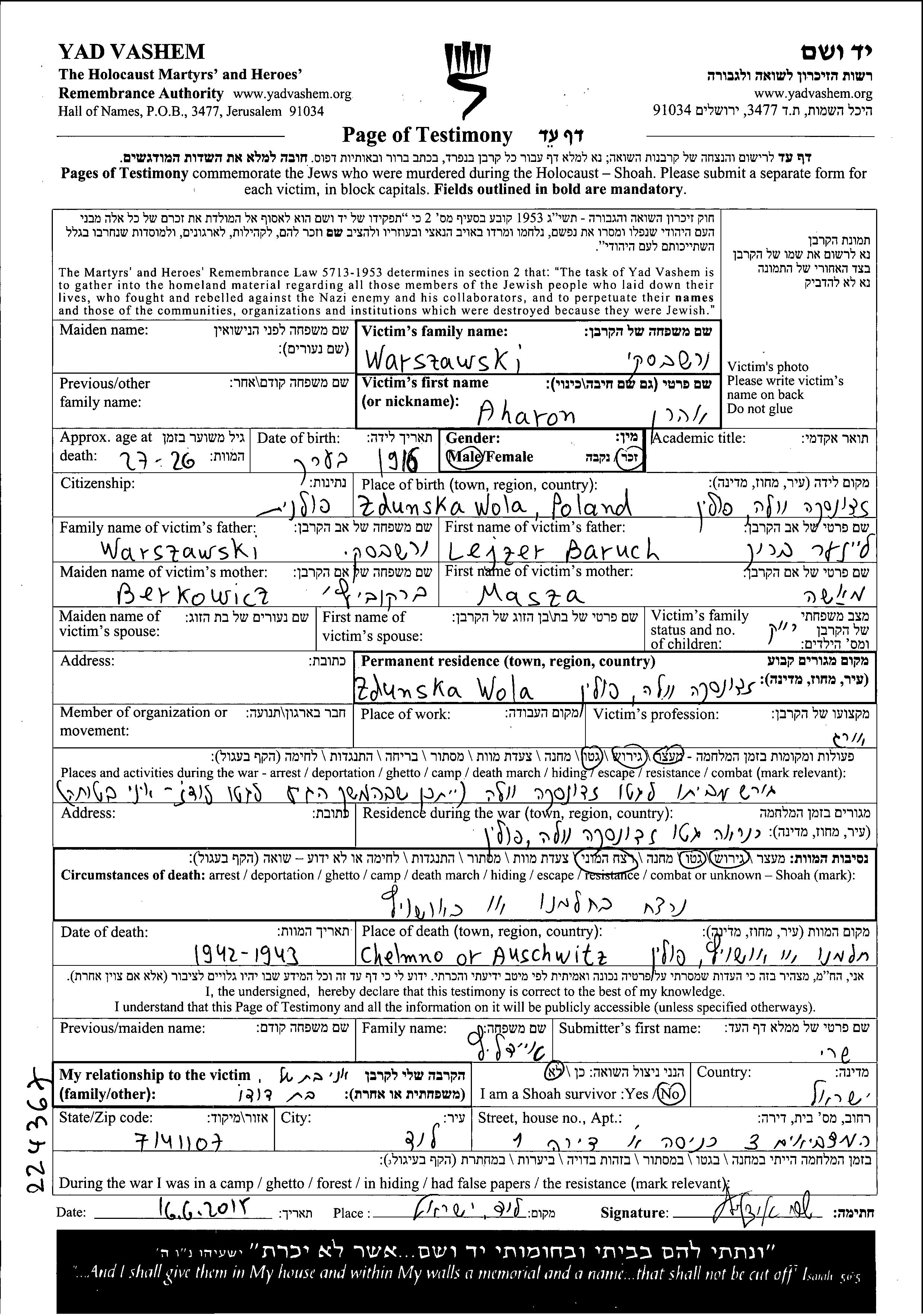 Warszawski Aharon 1916 Zdunska Wola, Pologne Feuille de témoignage