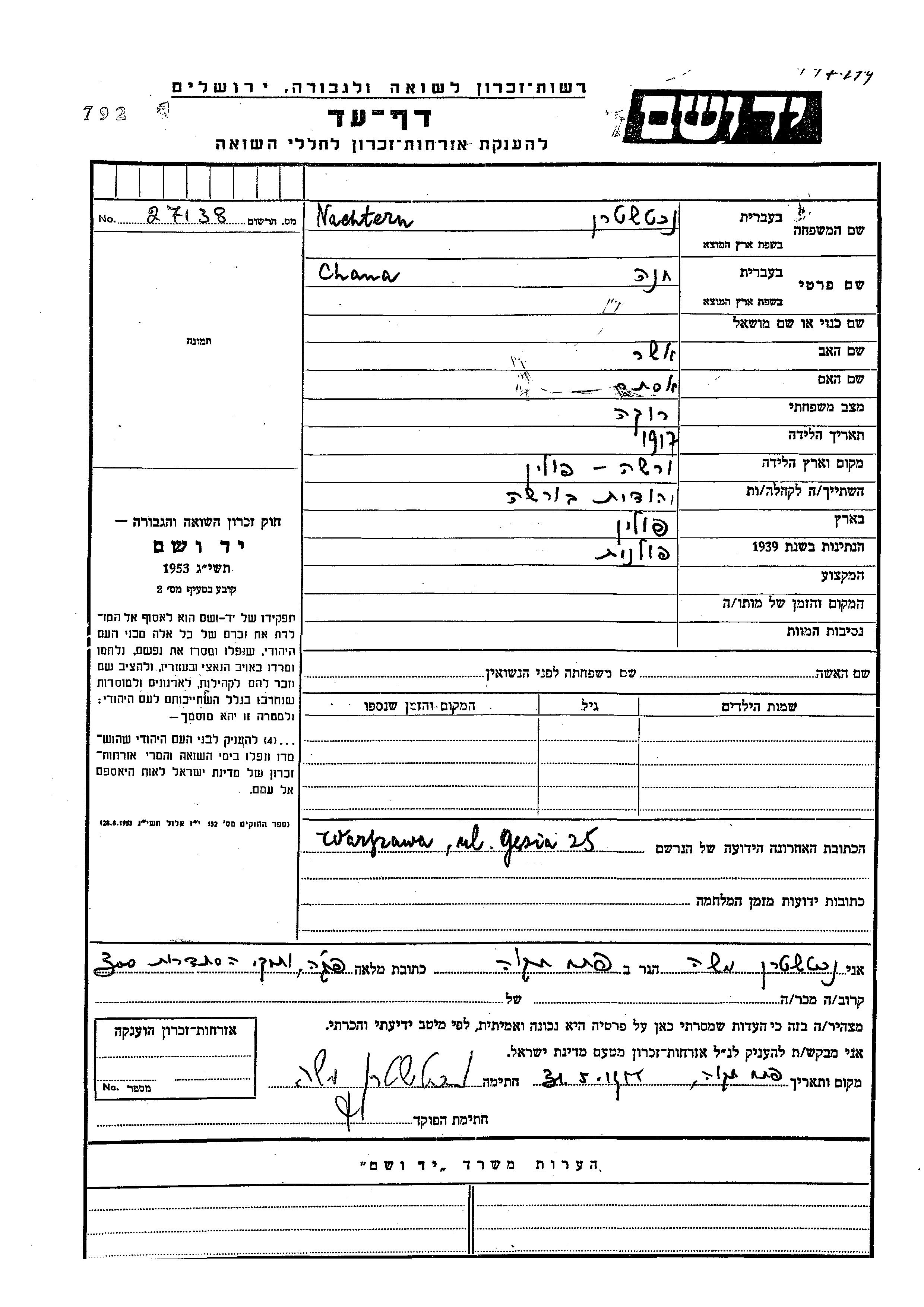 Nachtern | Chana | 1917 | Warszawa, Pologne | Feuille de témoignage |
