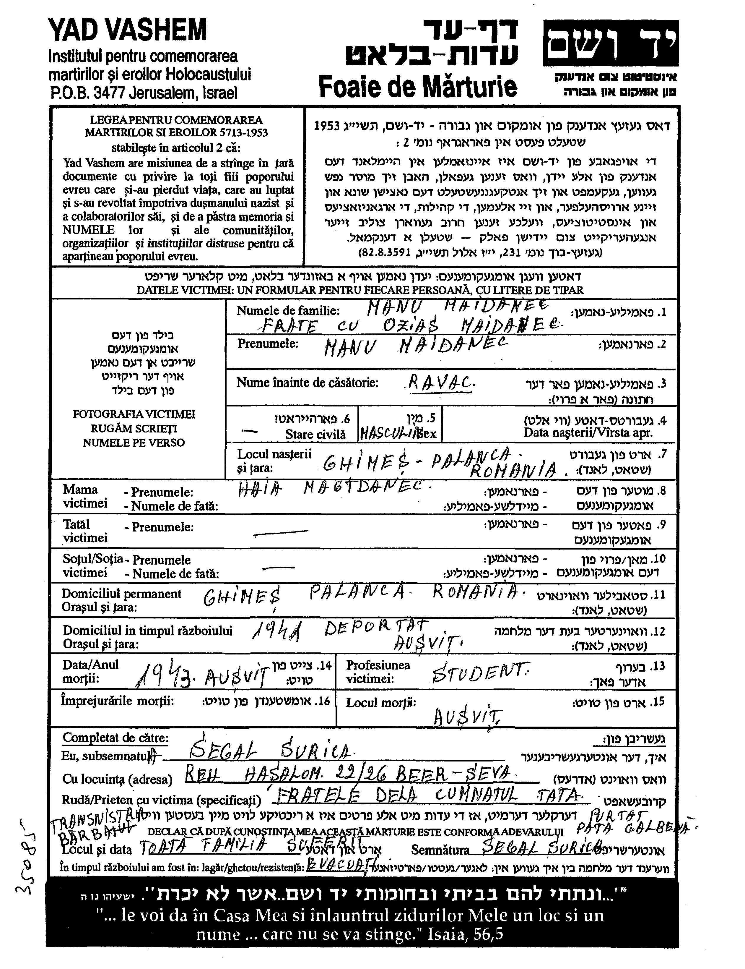 Maidanec | Manu | Ghimes Palanca, Roumanie | Feuille de témoignage | |