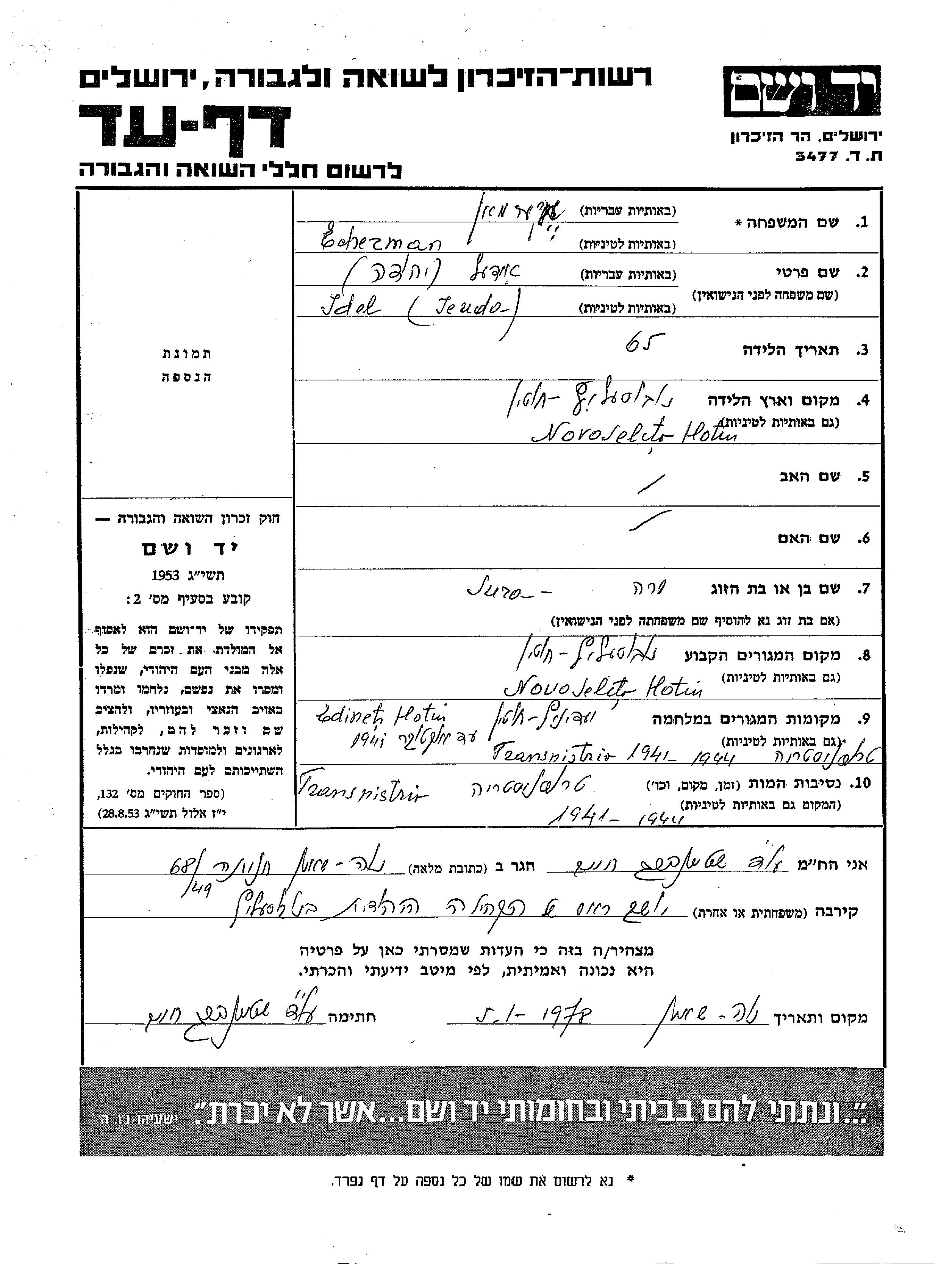 Eckerman | Yehuda | Novosulica, Roumanie | Feuille de témoignage |