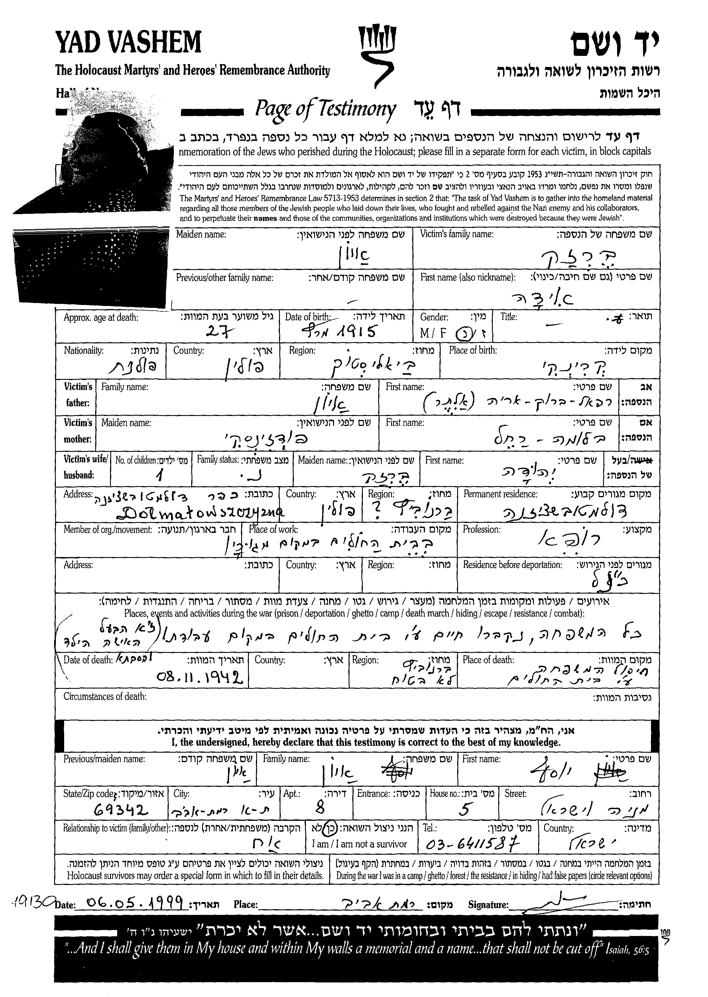 Berzak Ida 1915 Dolmatowszczyzna, Pologne Feuille de témoignage