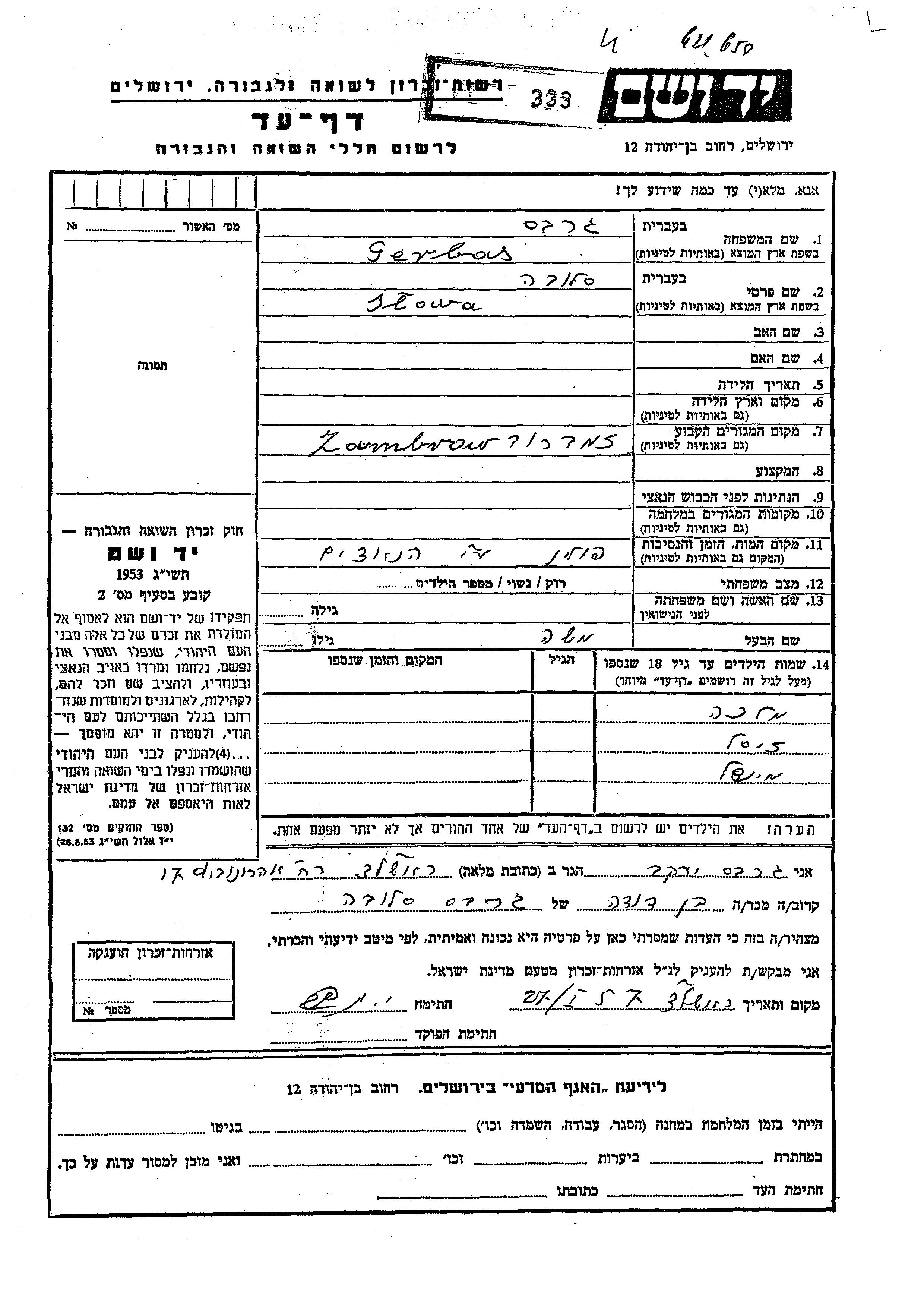 Zysl Gerbas. Avant la seconde guerre mondiale vivait à Zambrow, Pologne.