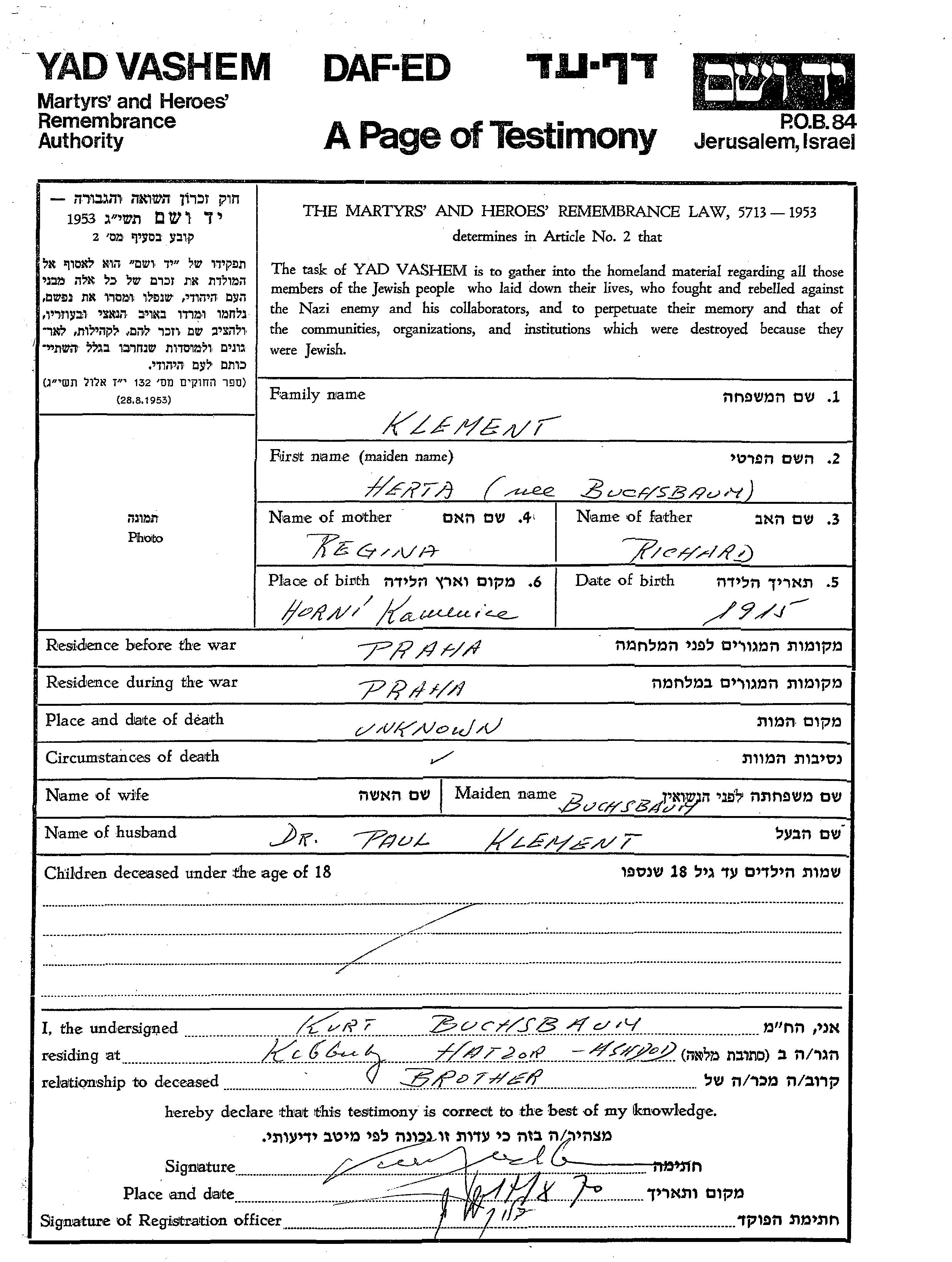 Klement Herta 1915 Praha, Tchécoslovaquie Feuille de témoignage