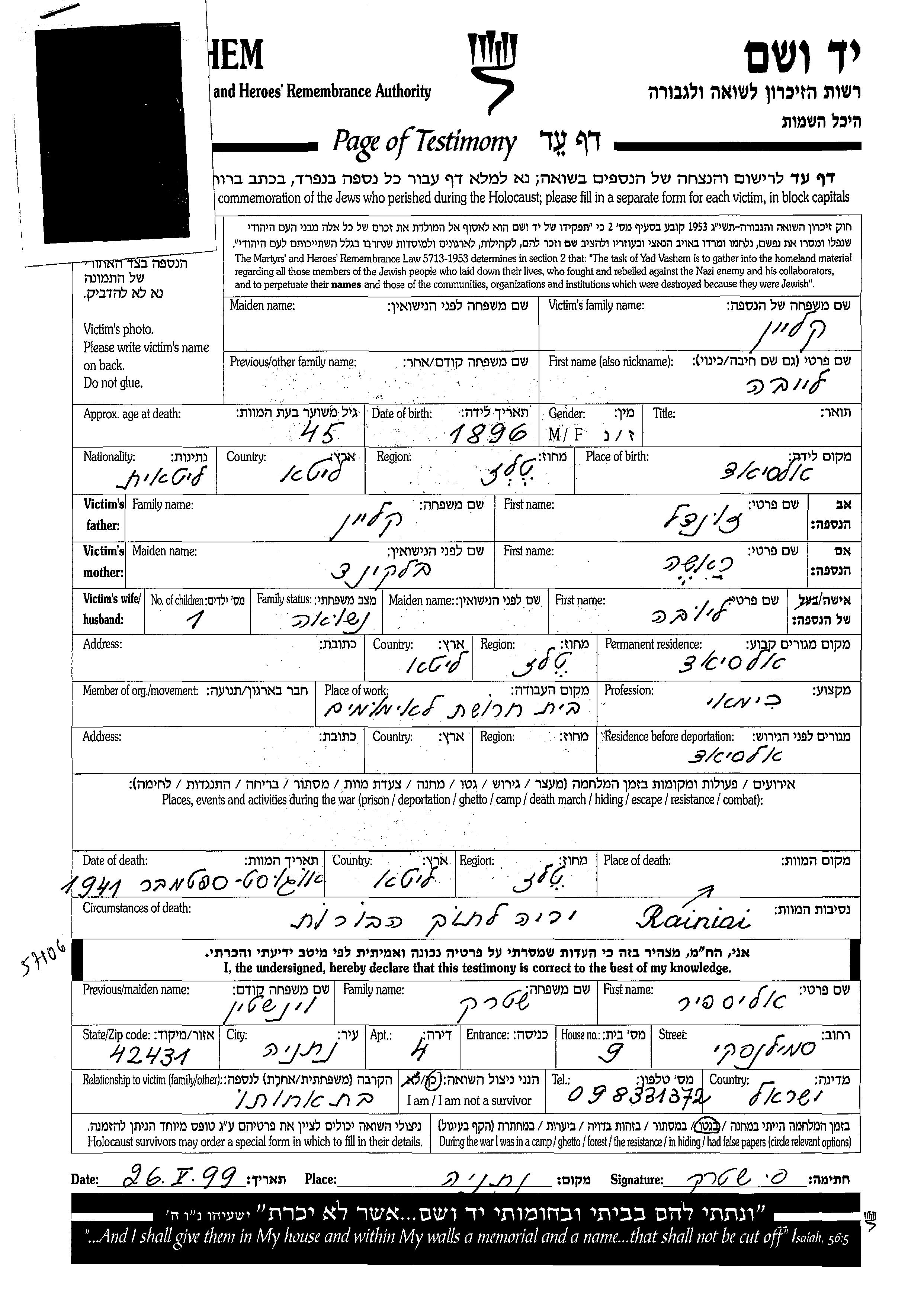 Yad Vashem - Pages of Testimony Names Memorial Collection