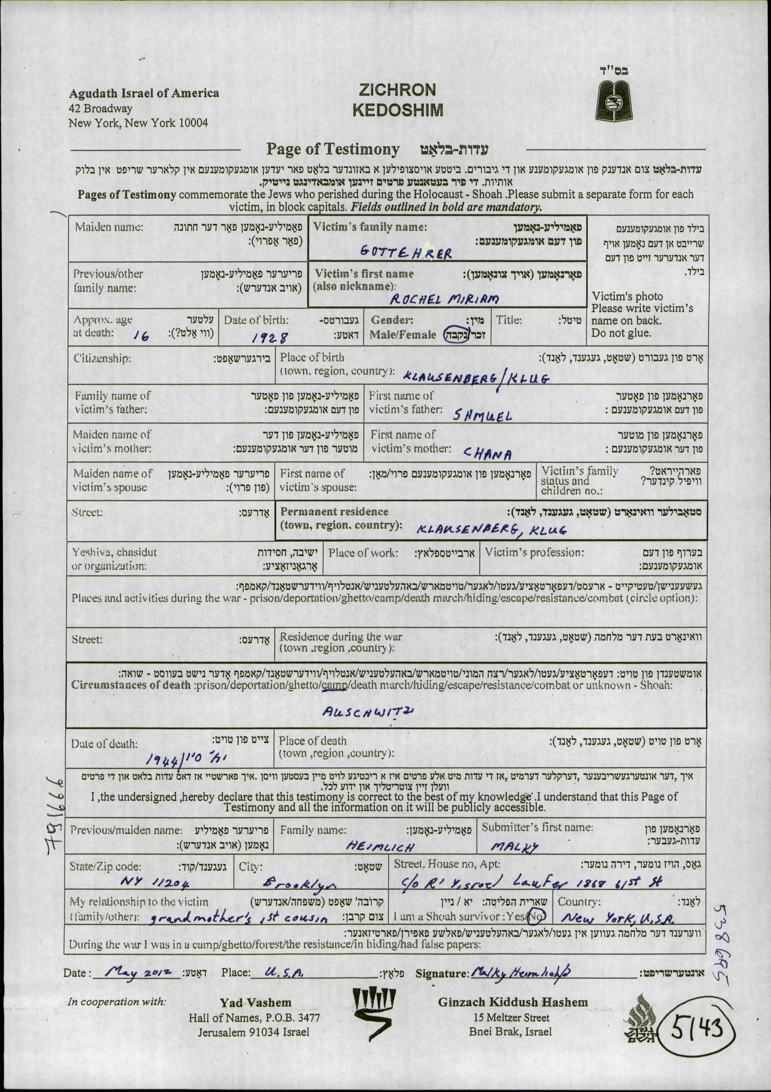 Gottehrer Rochel Miriam 1928 Klausenberg, Roumanie Feuille de témoignage