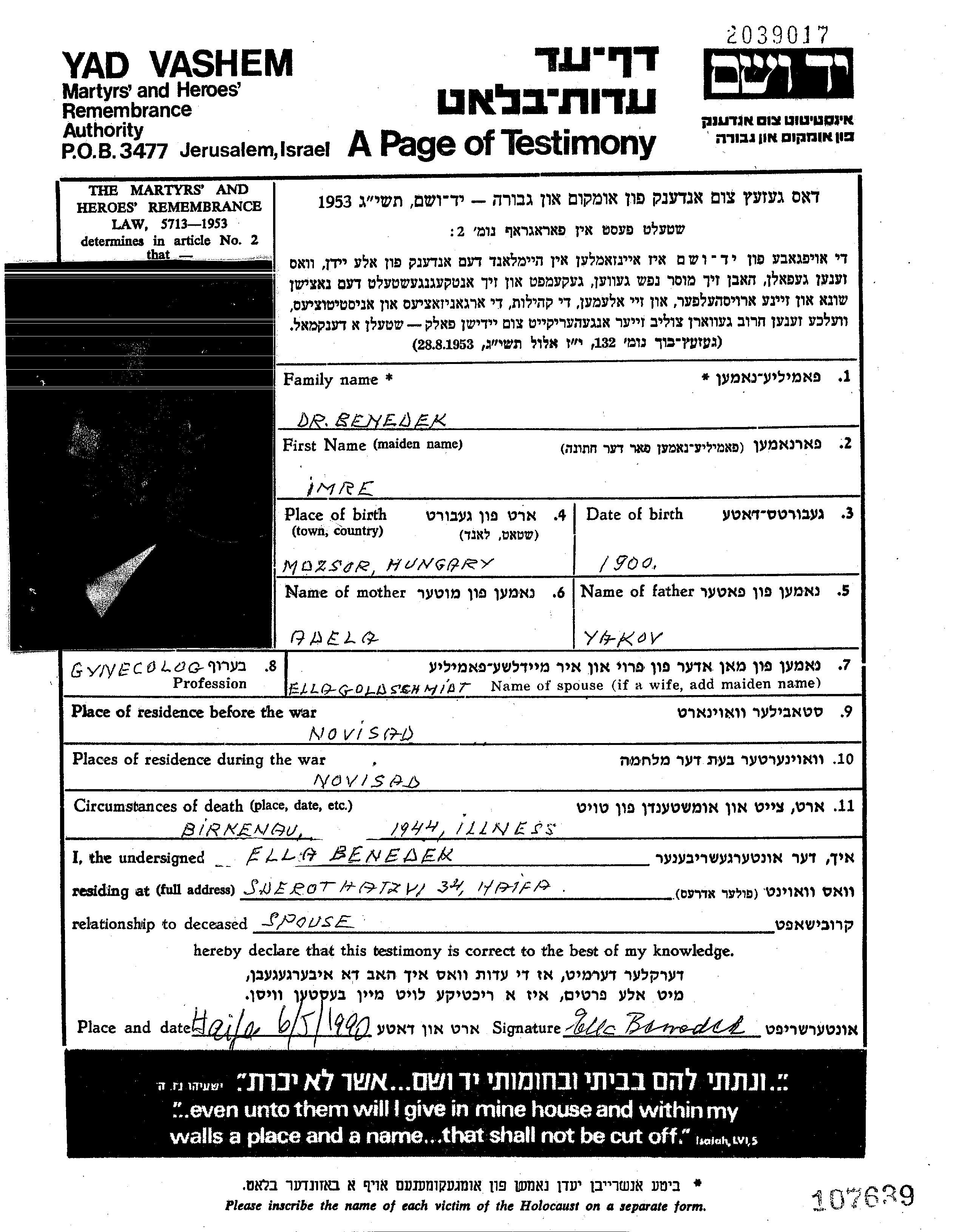 Benedek Imre 1900 Novisad, Yugoslavie Feuille de témoignage