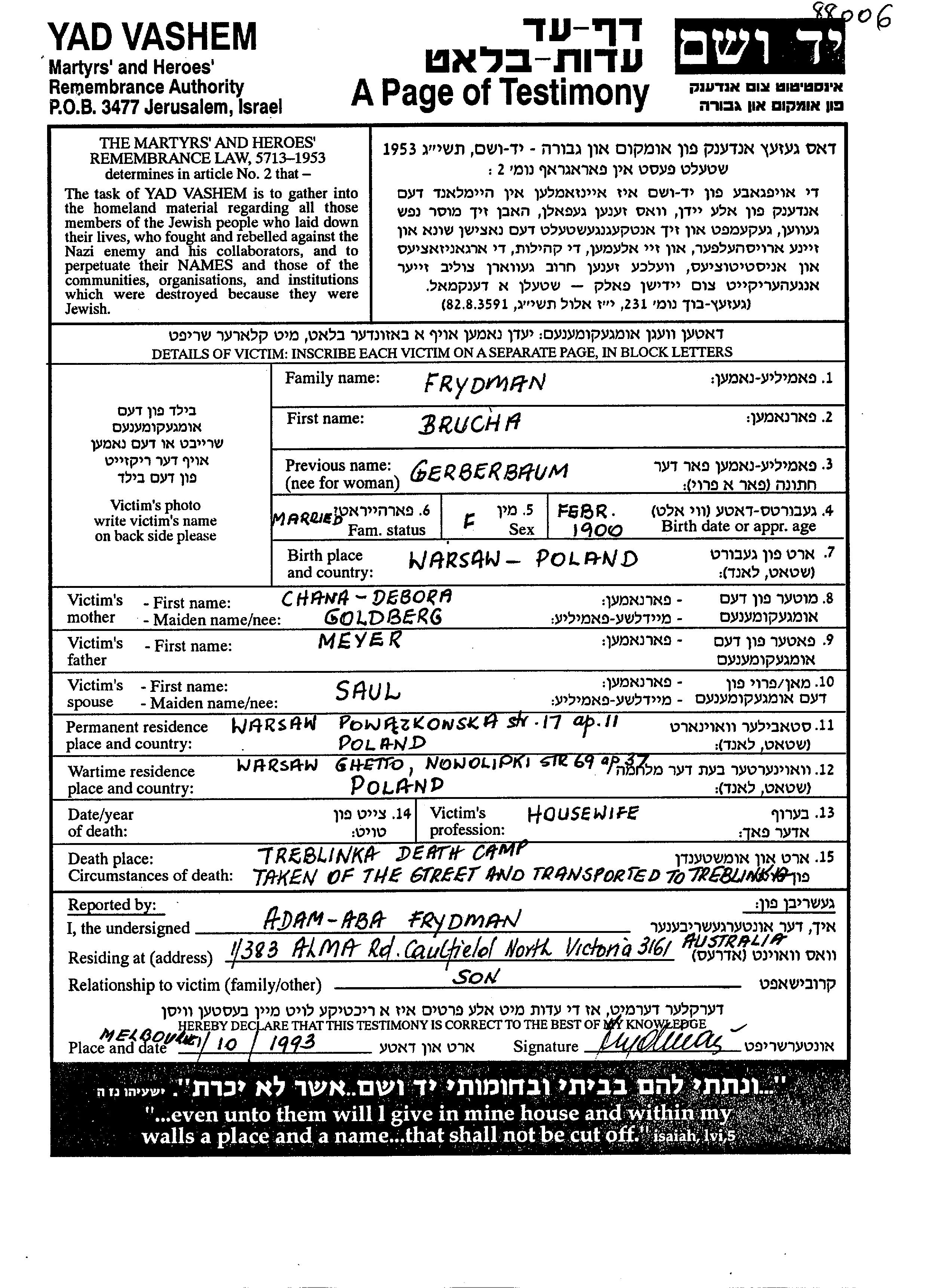 Frydman Brucha 1900 Warszawa, Pologne Feuille de témoignage