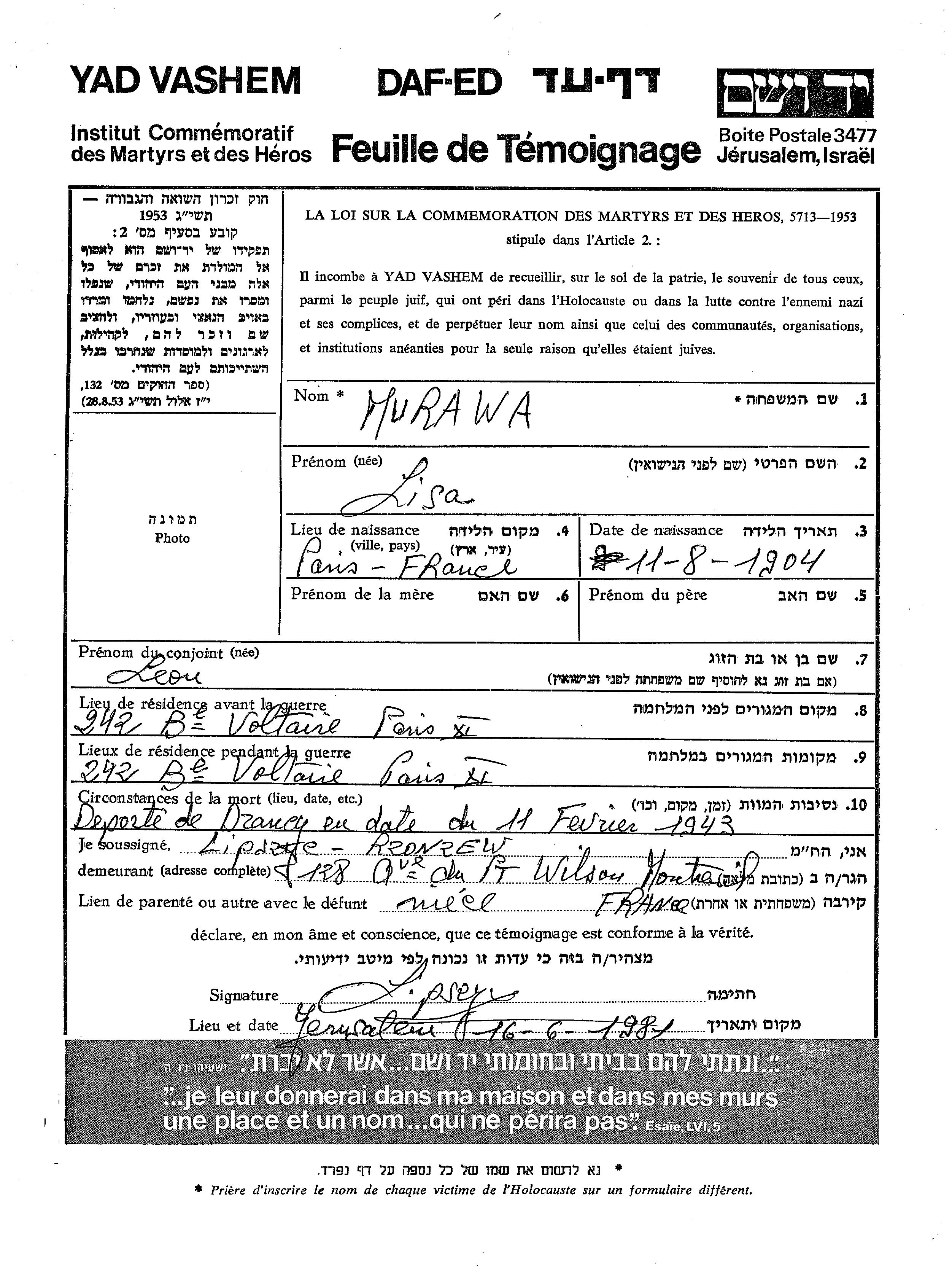 Murawa Lisa 1904 Paris, France Liste de personnes persécutées