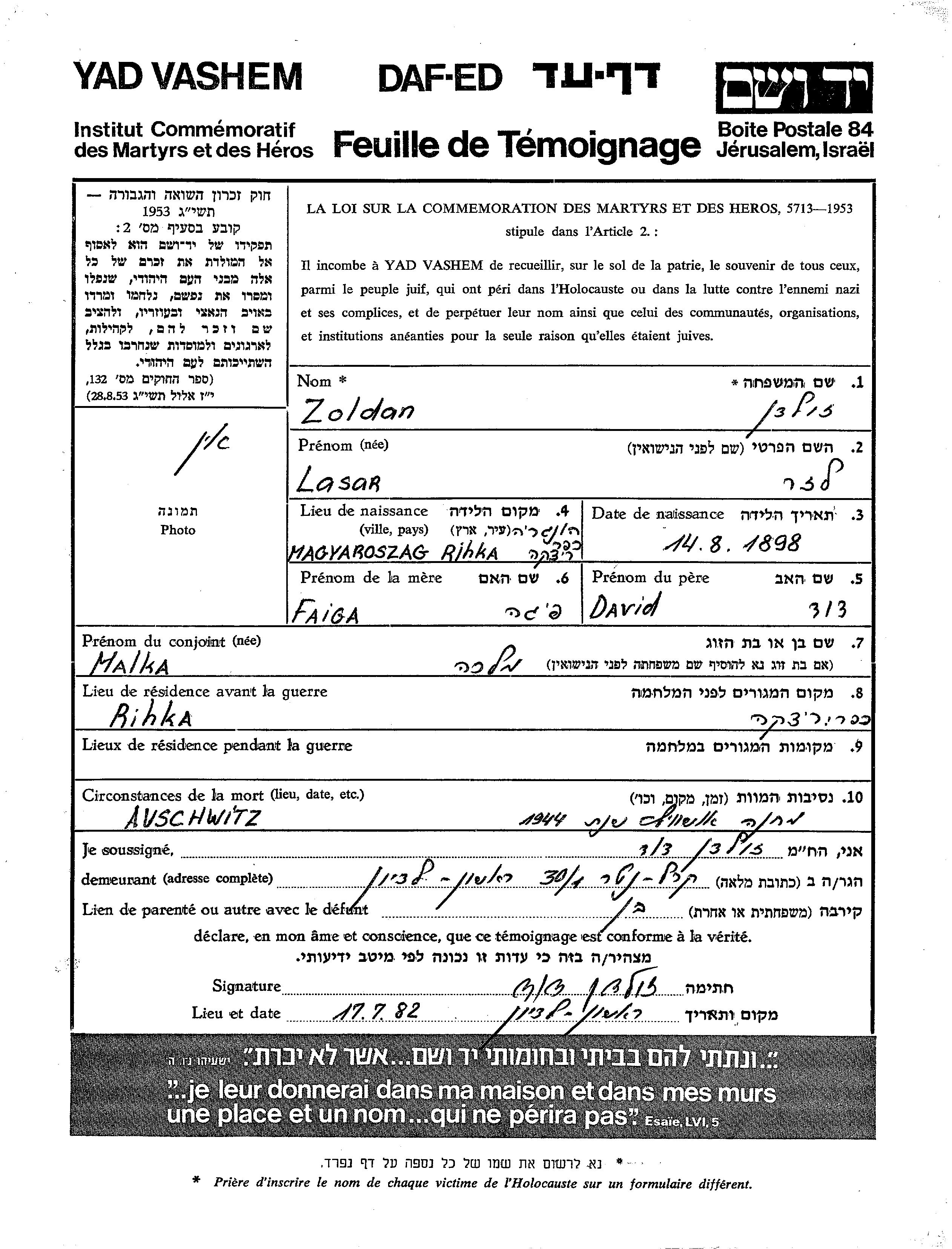 Zoldan Lazar 1892 endroit inconnu, Feuille de témoignage