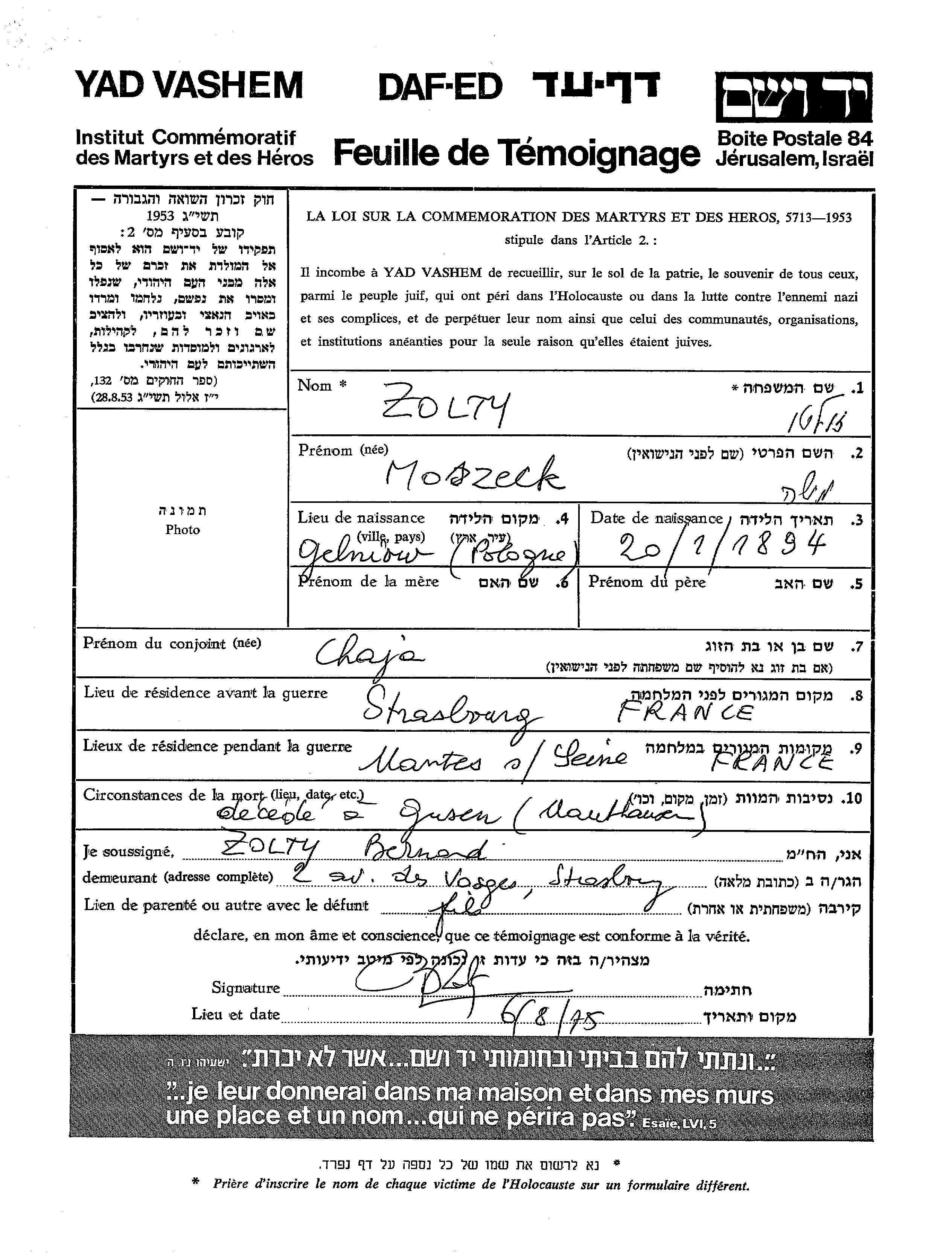 Moshe Zolty Zolto est né à Gielniow, Pologne en 1894. Avant la seconde guerre mondiale il vivait à Strasbourg, France.