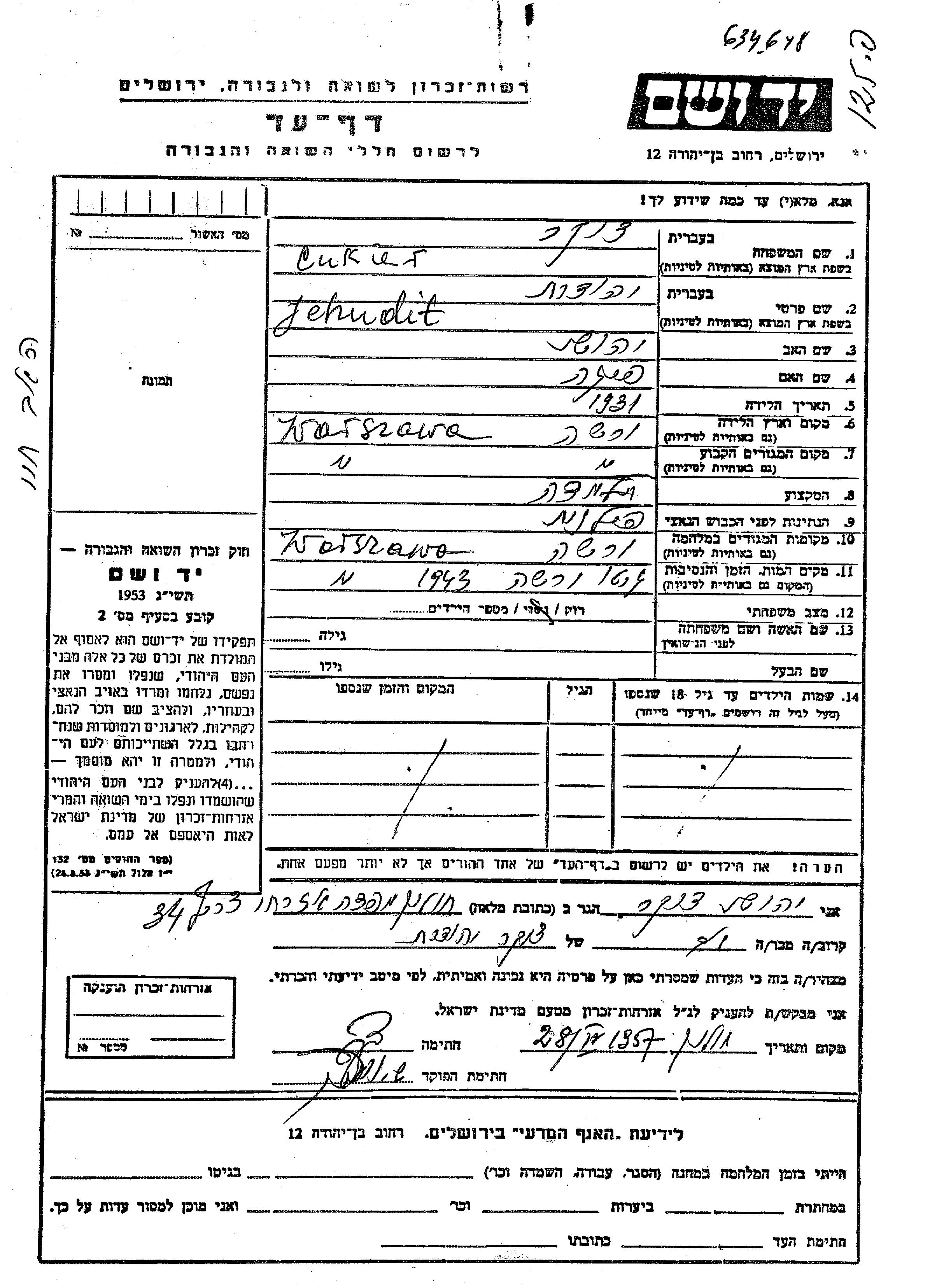 Cukier Jehudit 1931 Warszawa, Pologne Feuille de témoignage