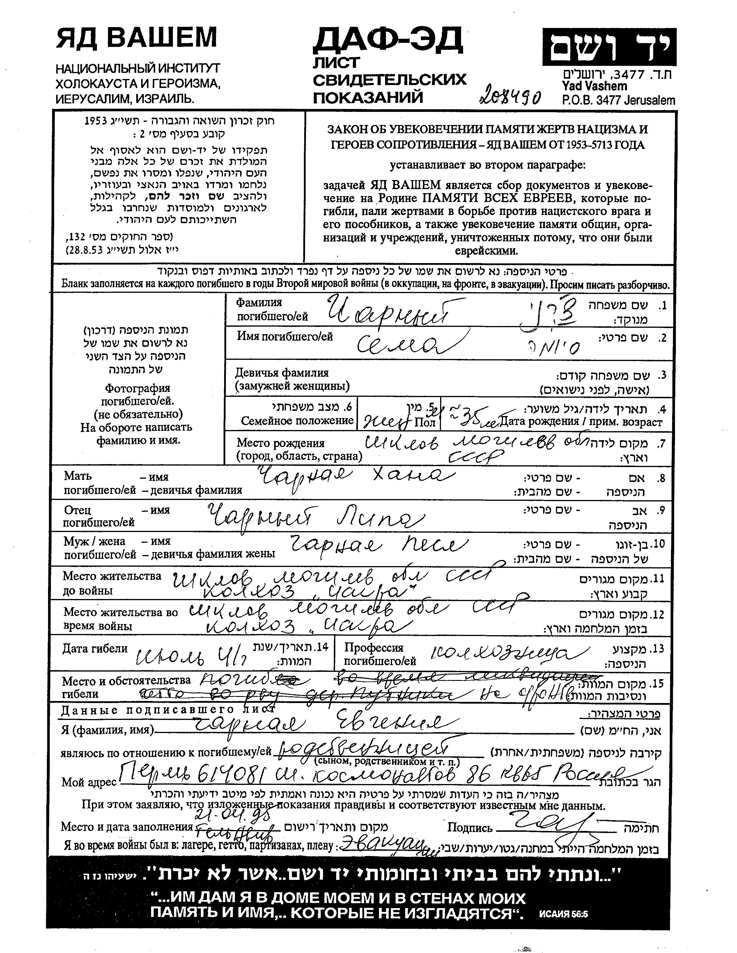 Charnyy | Semyon | 1905 | Shklov, Bélorussie (URSS) | Feuille de témoignage |