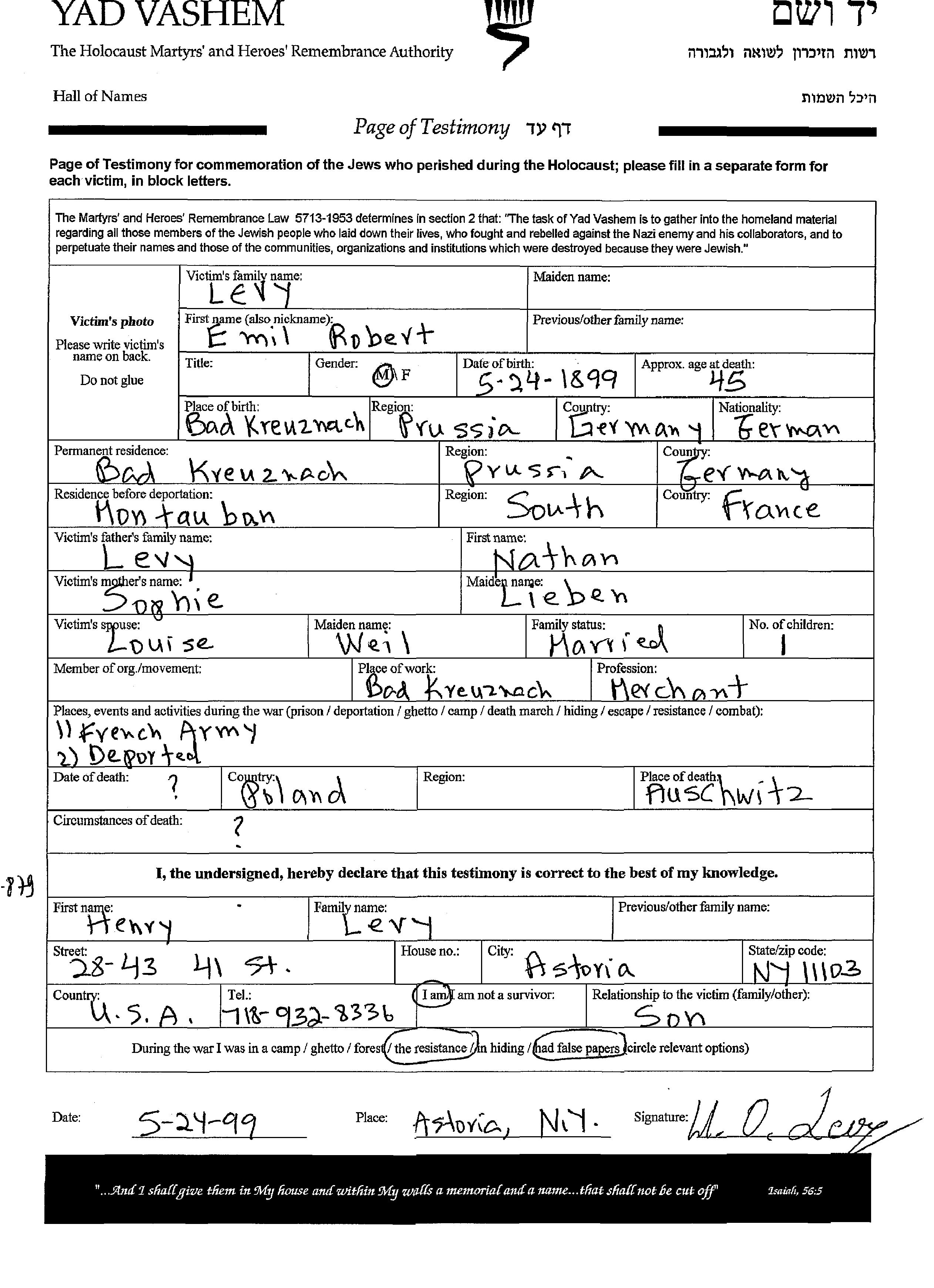 Levi Emil 1899 Bad Kreuznach, Allemagne Feuille de témoignage