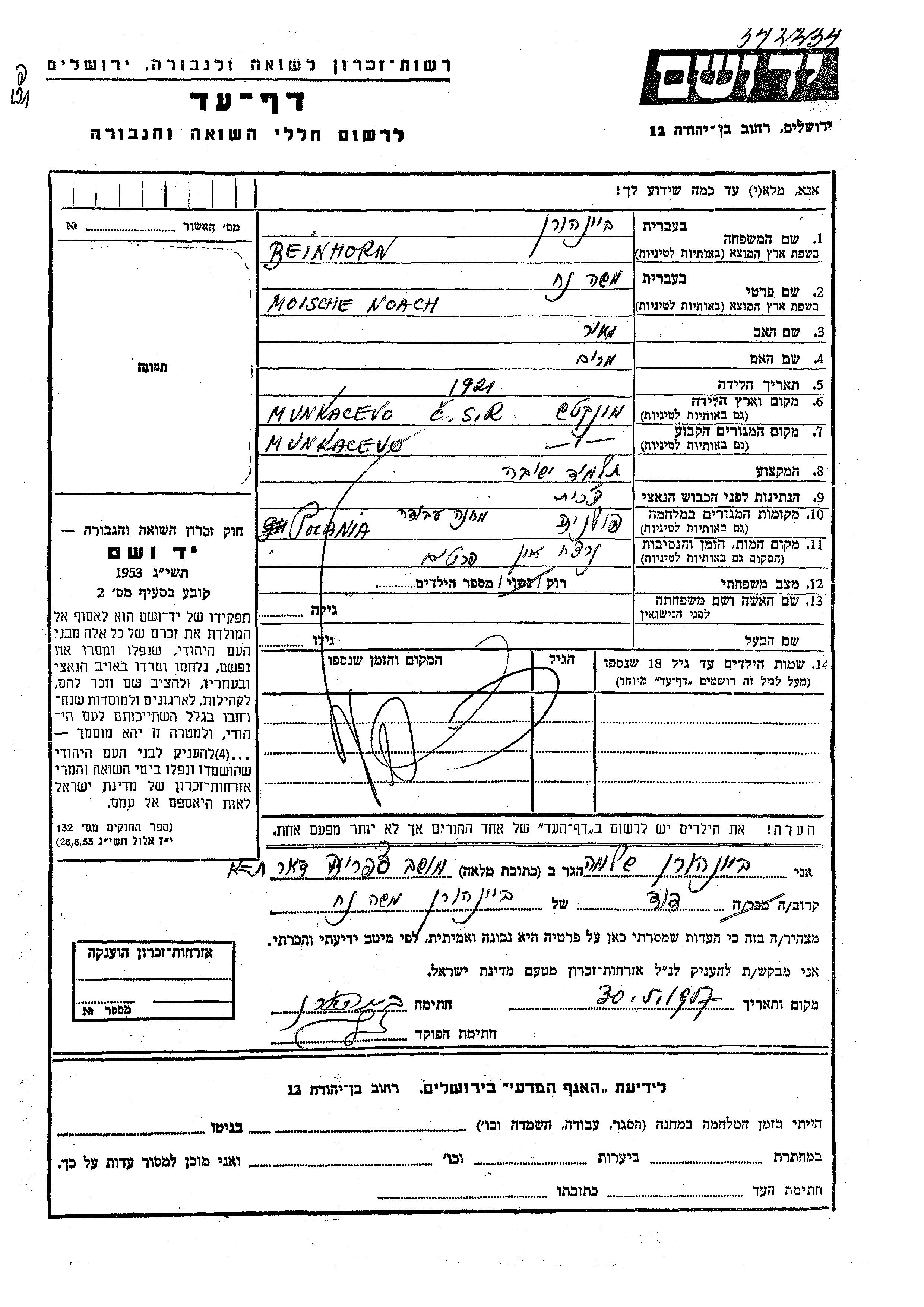 Beinhorn Moische Noach 1921 Munkacevo, Tchécoslovaquie Feuille de témoignage