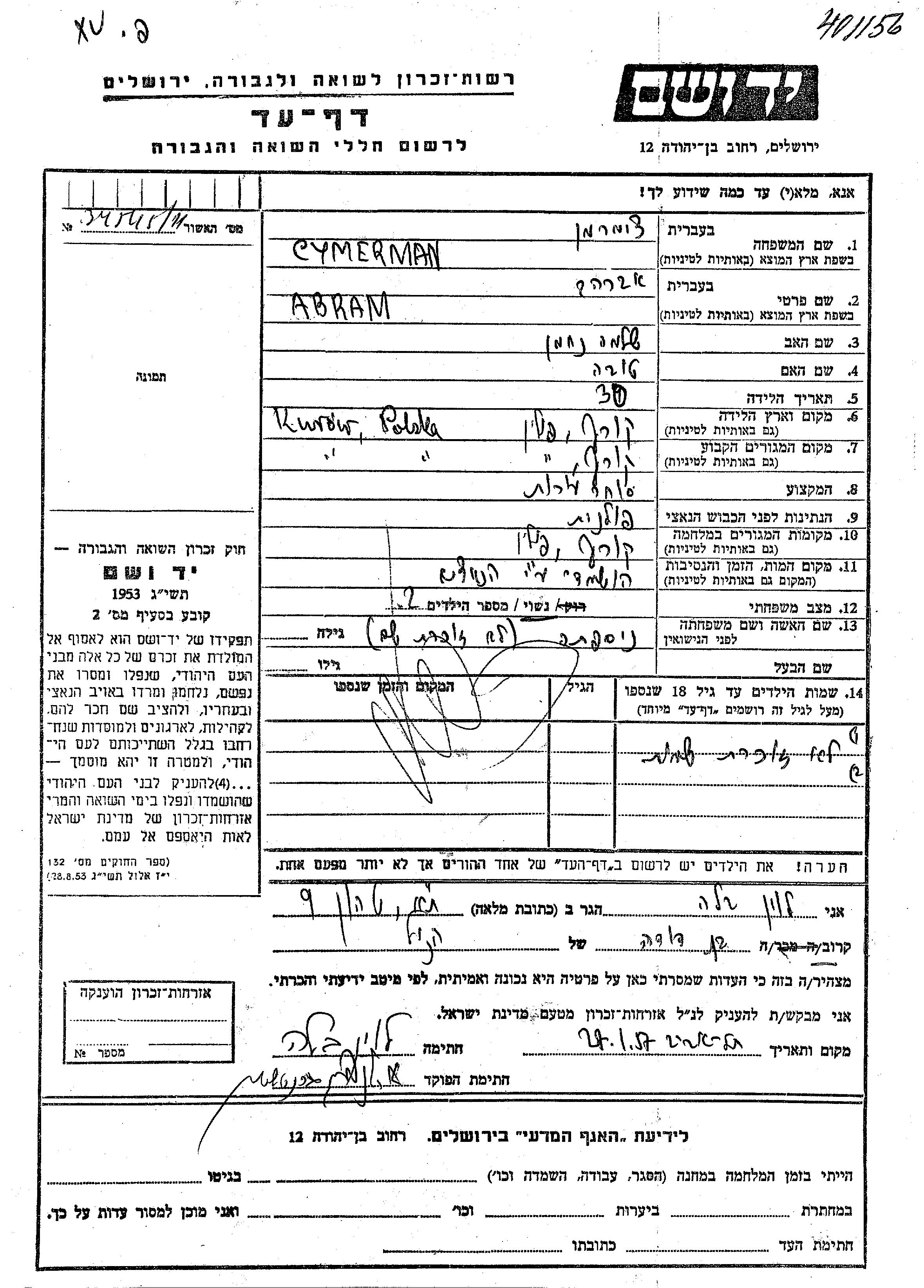 Avraham Zeev Cymerman est né à Kurow, Pologne en 1905. Avant la seconde guerre mondiale il vivait à Kurow, Pologne.