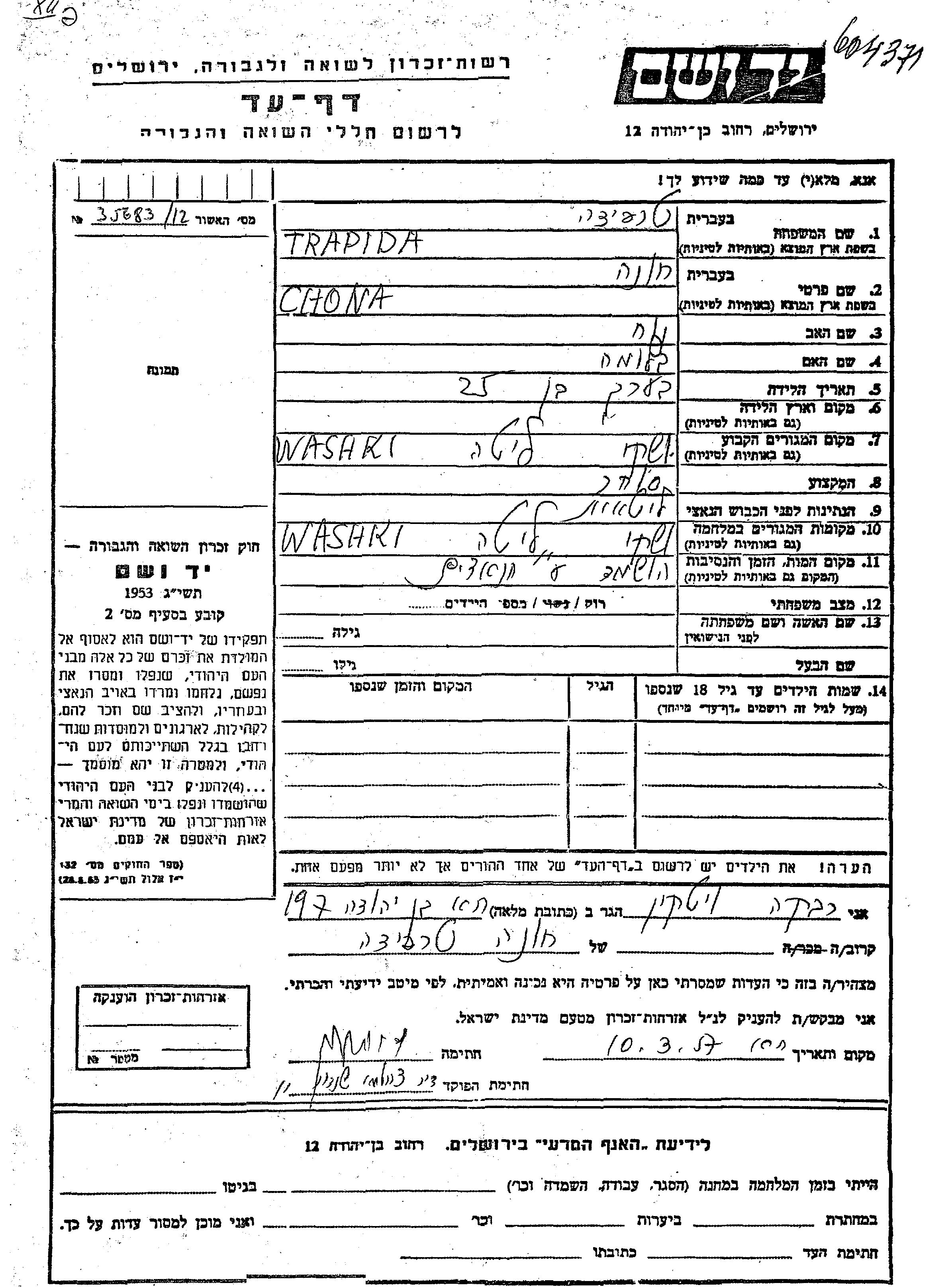 Trapida Chona Vashki, Lituanie Feuille de témoignage
