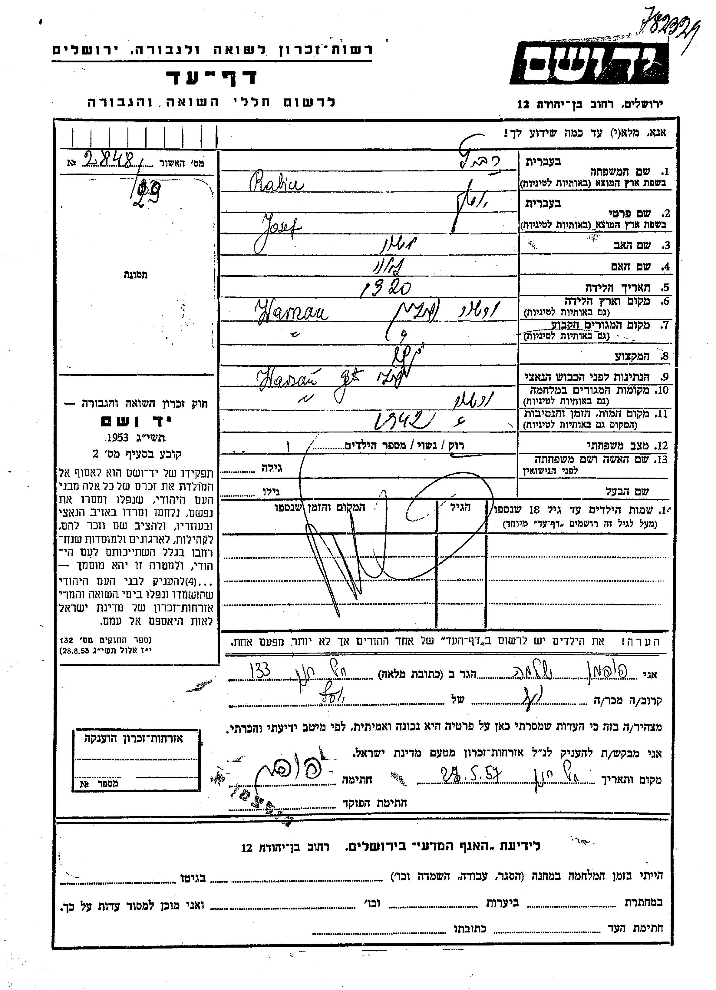 Yosef a été assassiné pendant la Shoah. Lieu de la mort: endroit inconnu en 1942.