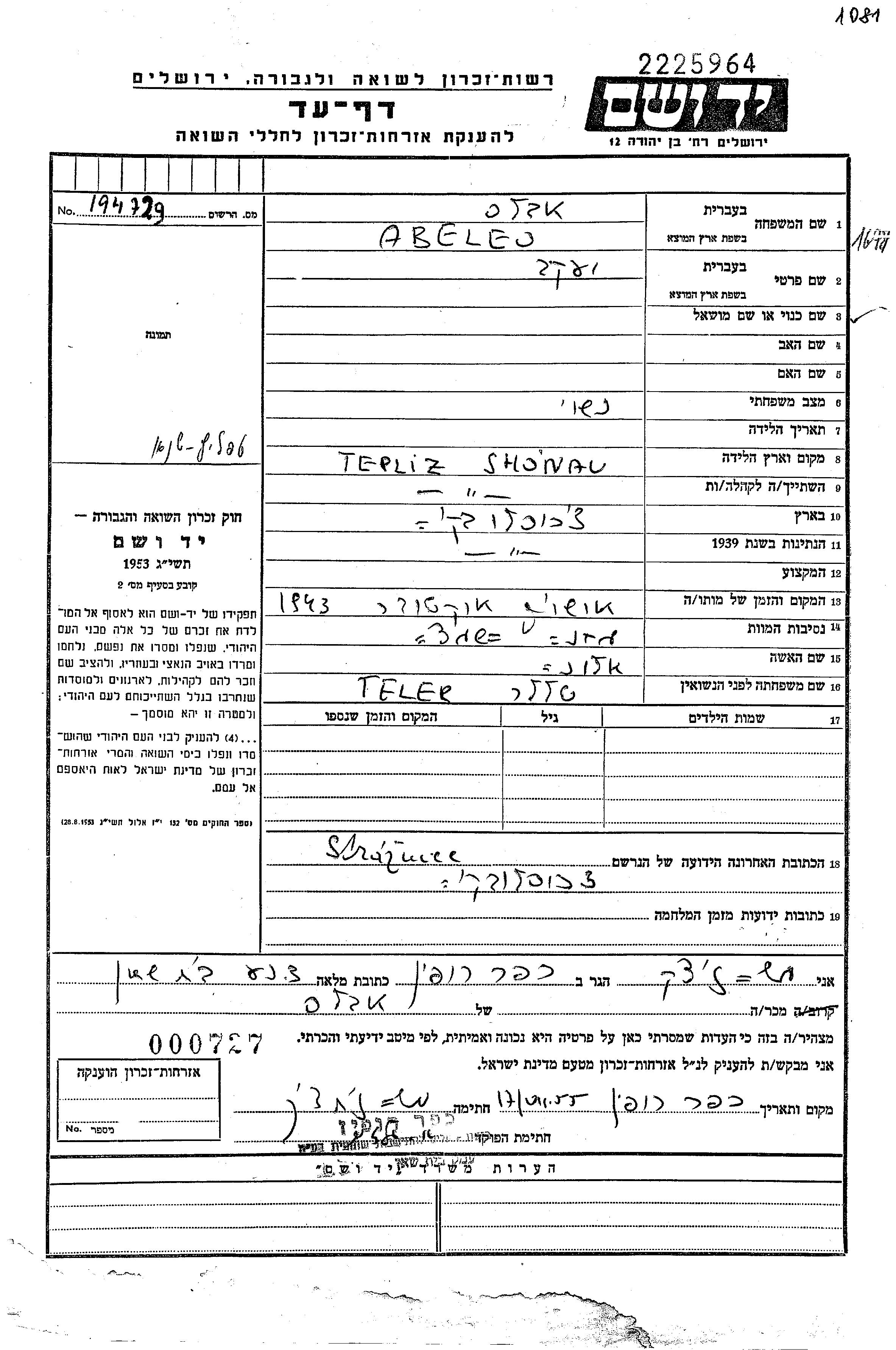 Abeles Yaakov Teplitz Schoenau, Tchécoslovaquie Feuille de témoignage