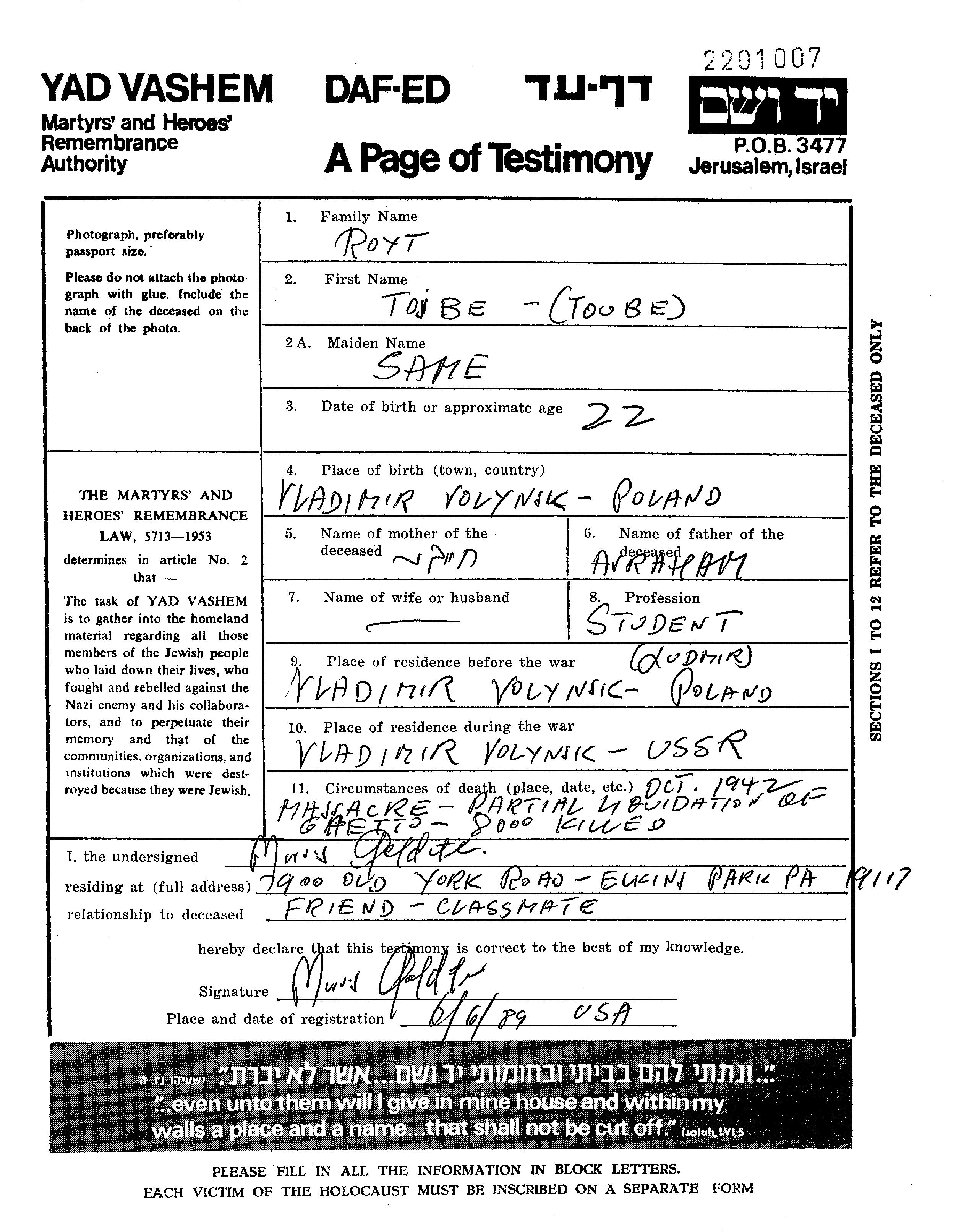 Royt Toibe 1920 Vladimir Volinski, Pologne Feuille de témoignage