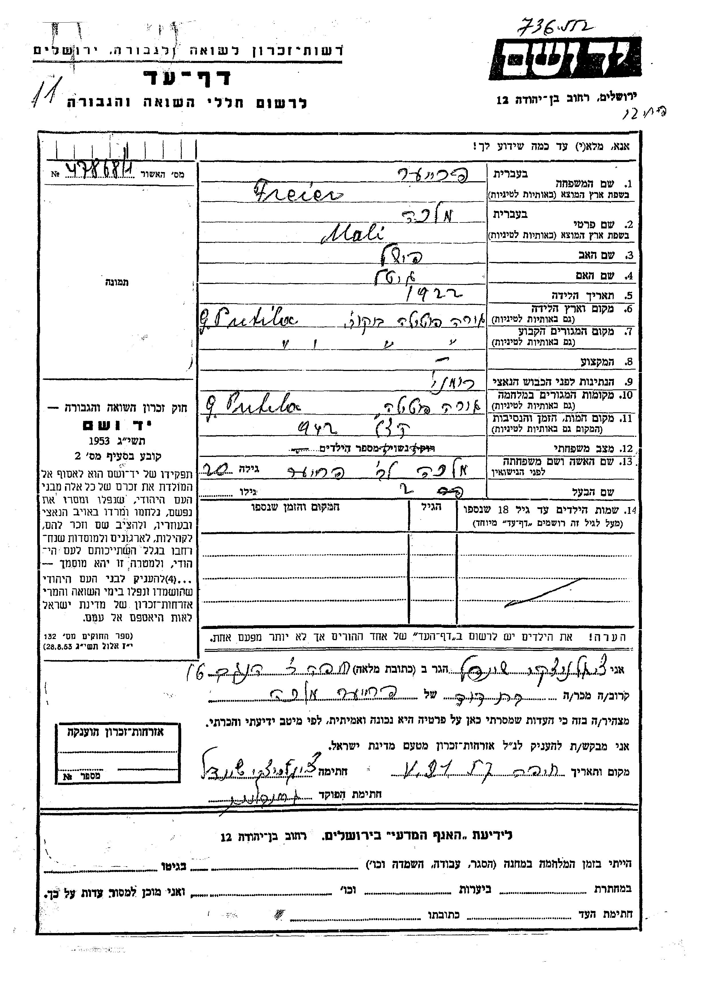 Freier | Mali Malka | 1922 | Putila, Roumanie | Feuille de témoignage |