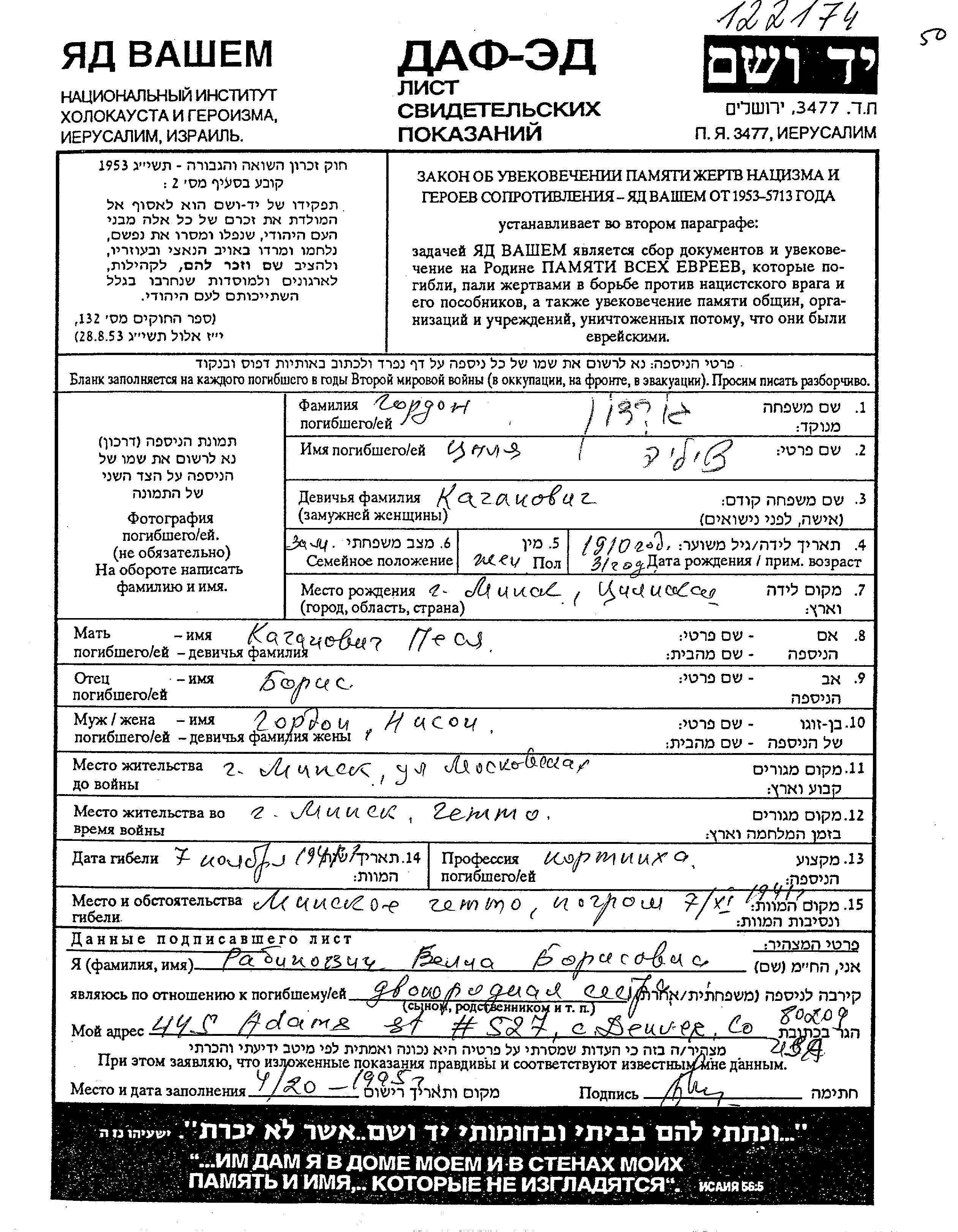 Gordon | Tzilia | Minsk, Bélorussie (URSS) | Feuille de témoignage |
