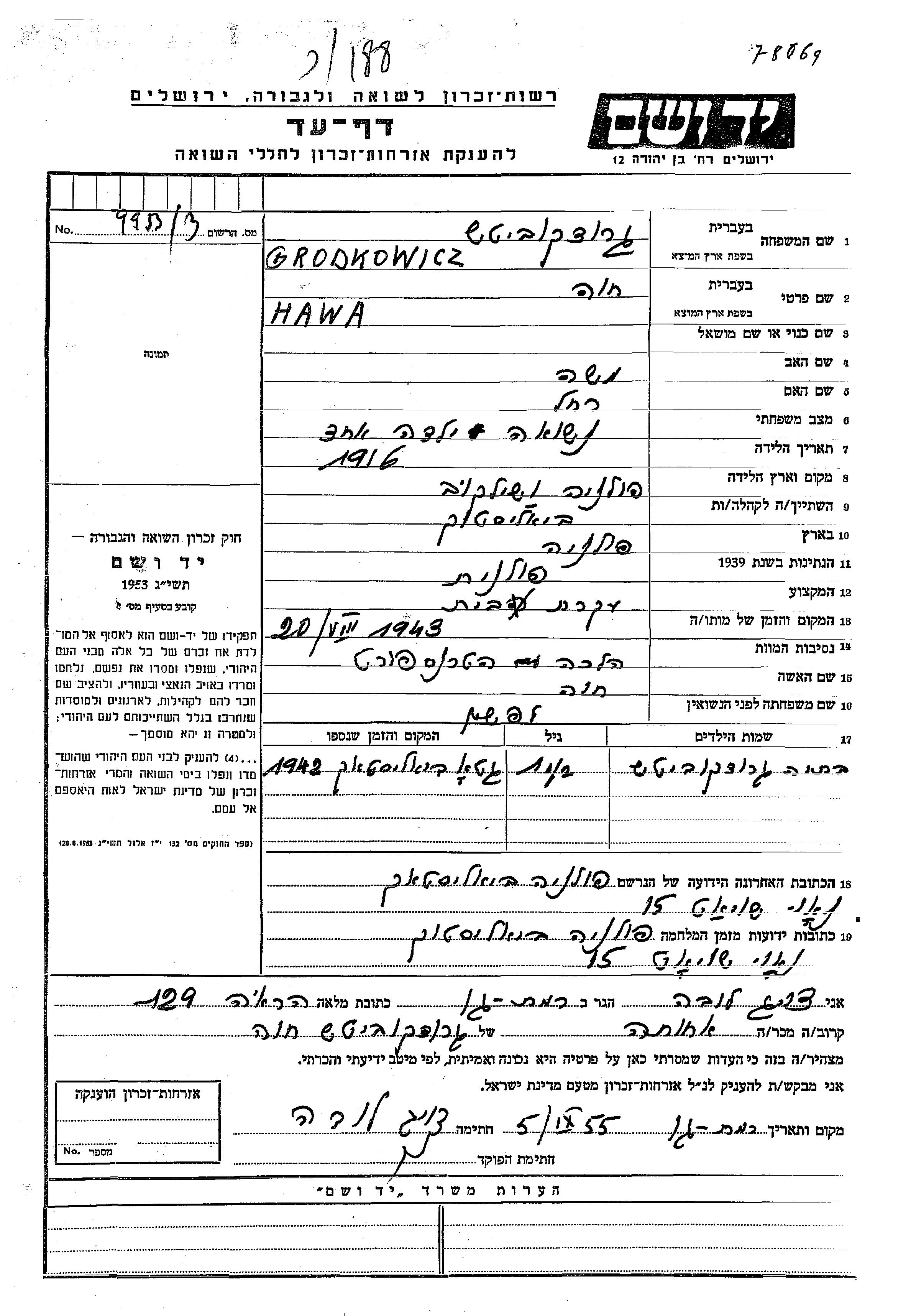 Grodkowicz Hawa 1916 Bialystok, Pologne Feuille de témoignage