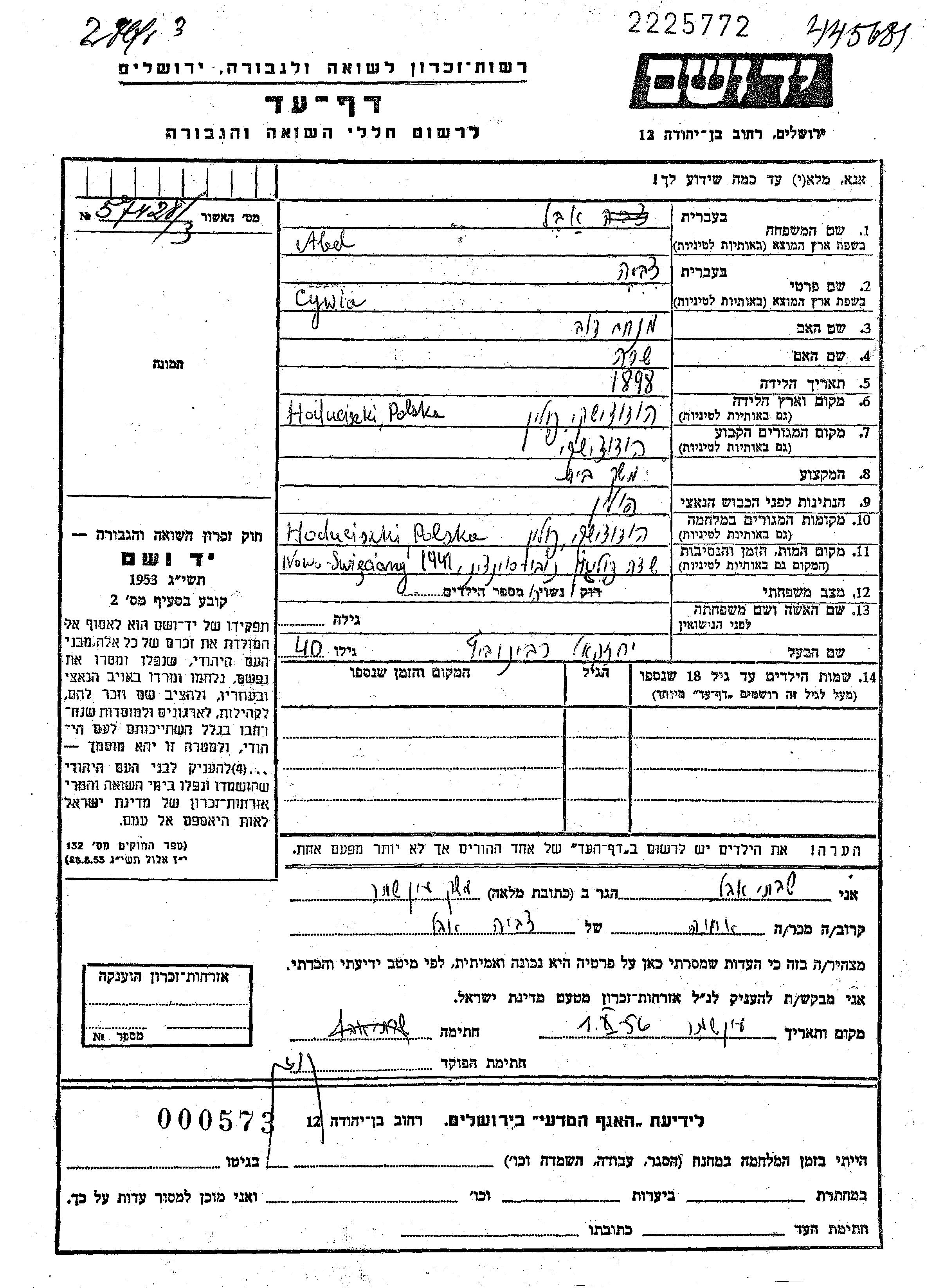Abel Tzvia Rabinowitz Abel est née à Hoduciszki, Pologne en 1897. Elle était Femme au foyer. Avant la seconde guerre mondiale elle vivait à Hoduciszki, Pologne.