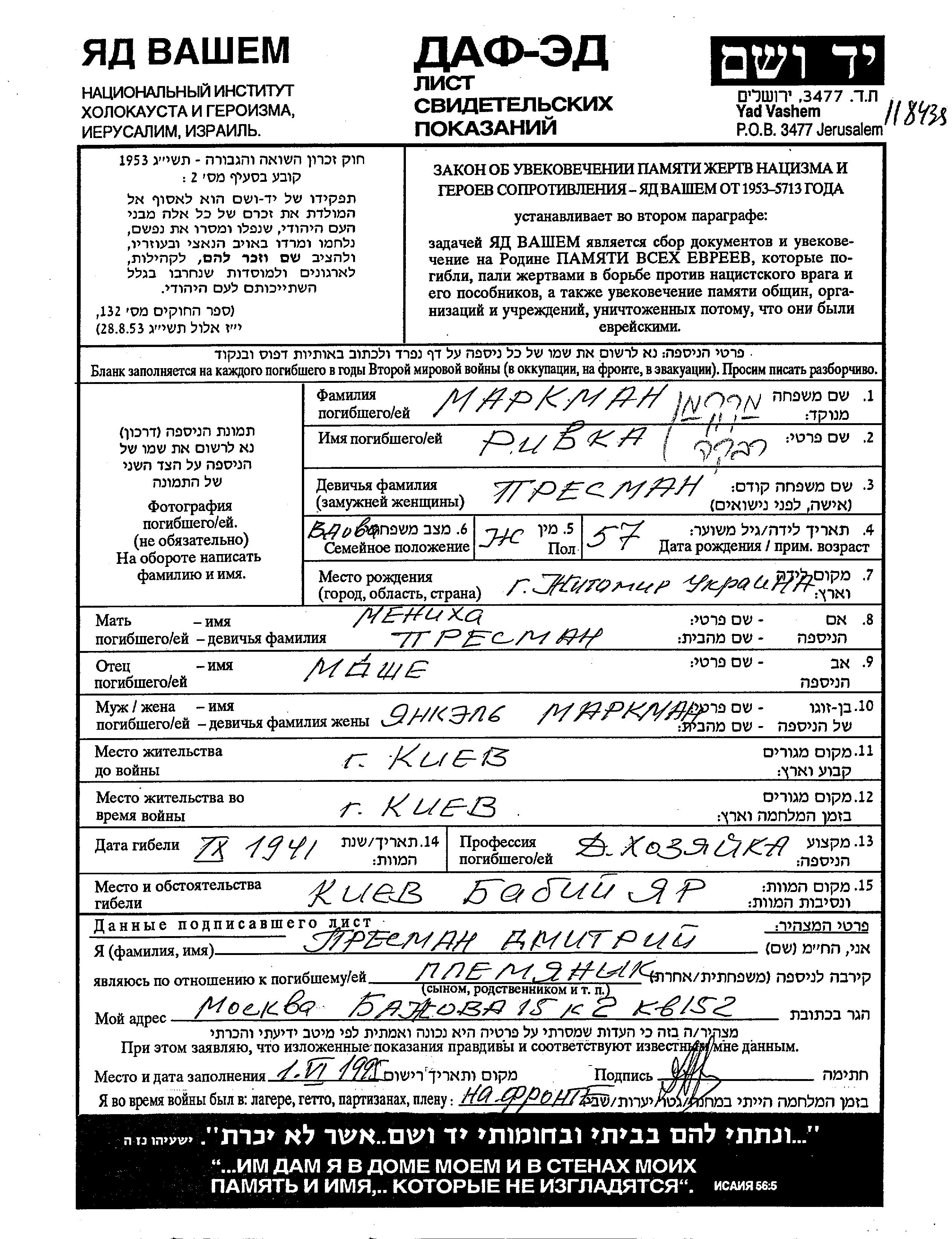 Markman Rivka 1884 Kiyev, Ukraine (URSS) Feuille de témoignage