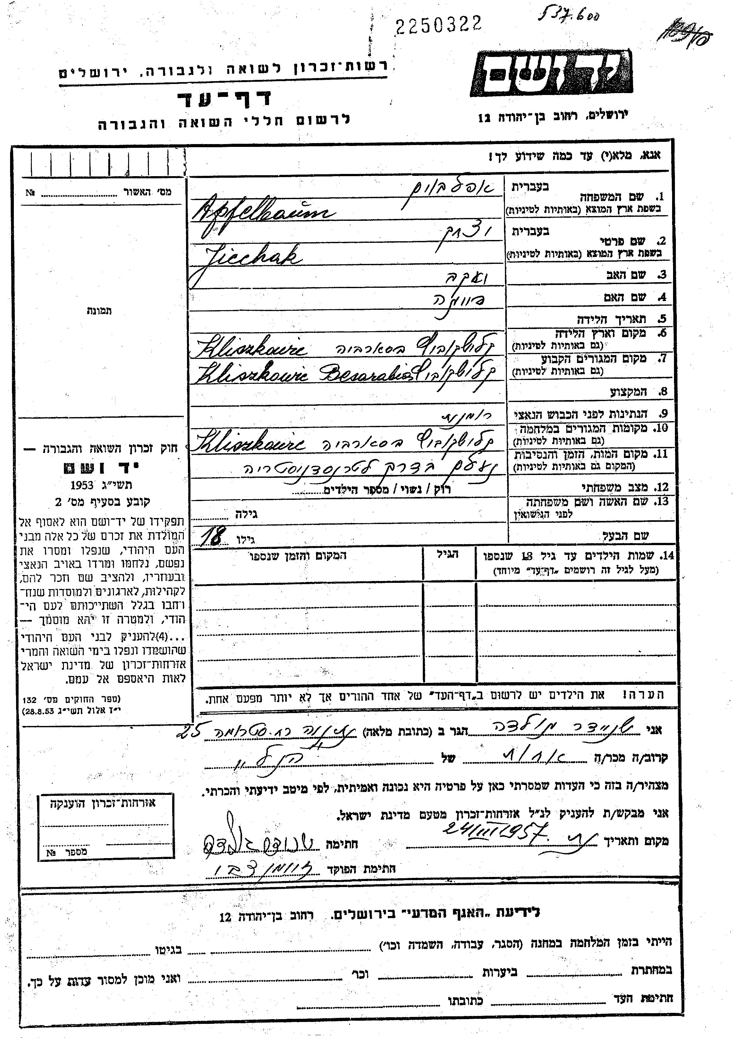 Apelboim | Yitzkhak | 1924 | Cliscauti, Roumanie | Feuille de témoignage |